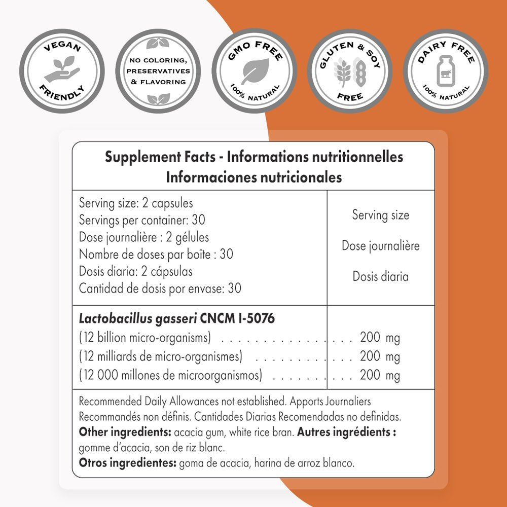 Lactobacillus gasseri (12 billion micro-organisms) | Other ingredients : acacia gum. | Each lactobacillus gasseri capsule is 100 mg and contains 6 billion microorganisms | **Warning: In order to preserve the lifespan of lactobacillus gasseri supplements, it is best to keep them refrigerated, especially if you live in a warm or humid climate.**/div>