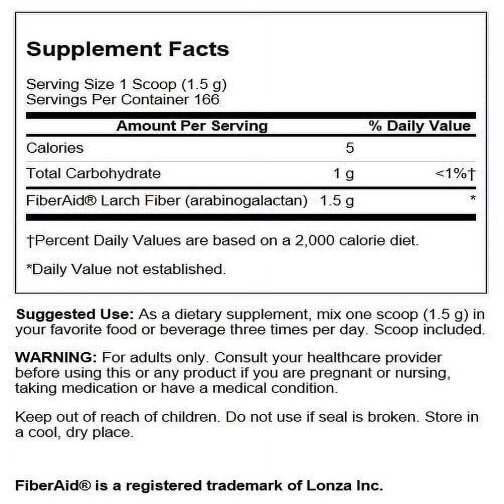 Calories 5,Calories from Fat 0,Total Carbohydrate 1 gram <1%,FiberAid Larch Fiber 1.5 grams *,As a dietary supplement, mix one scoop (1.5 grams) in your favorite food or beverage three times per day. Scoop included./div>