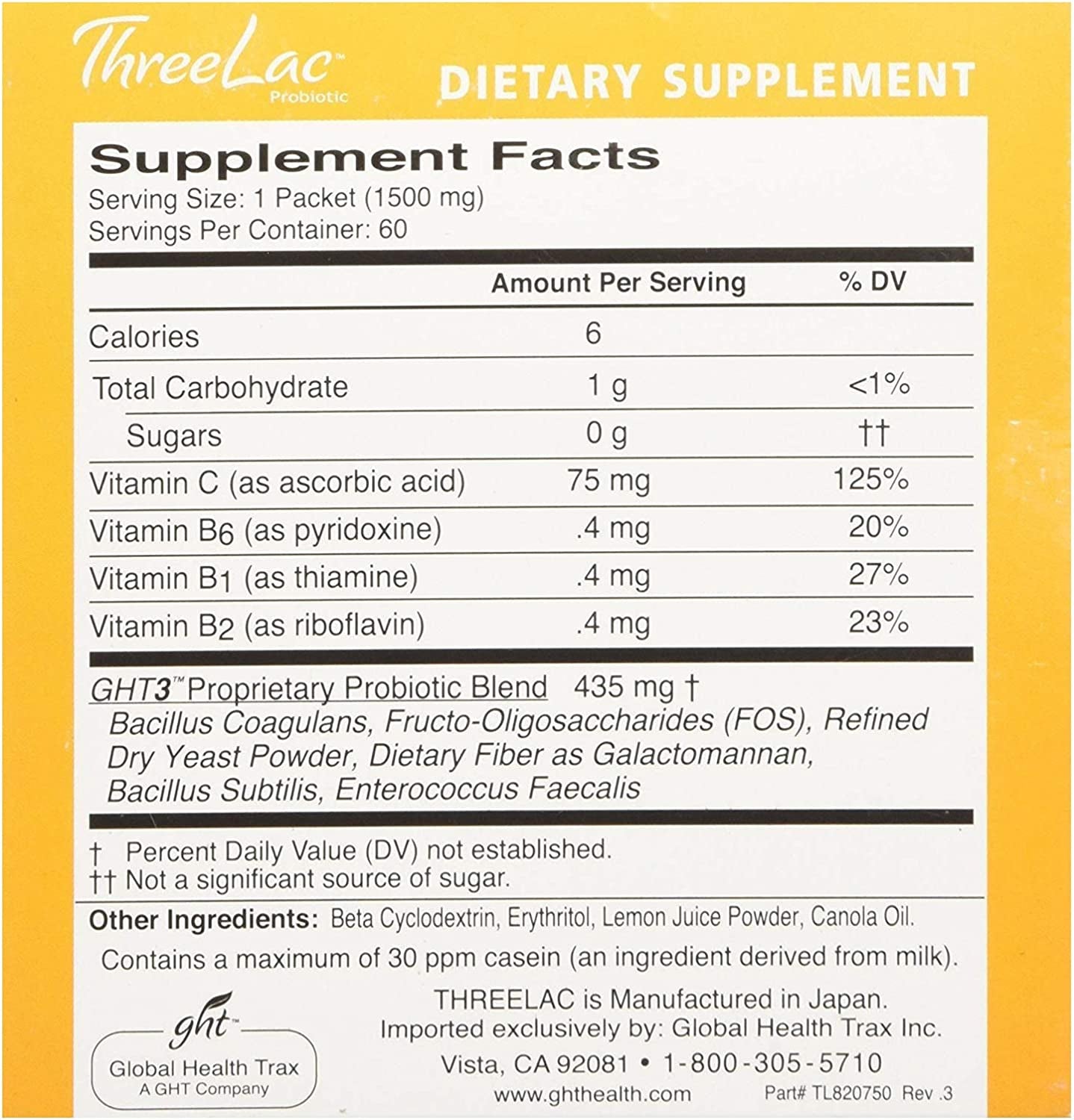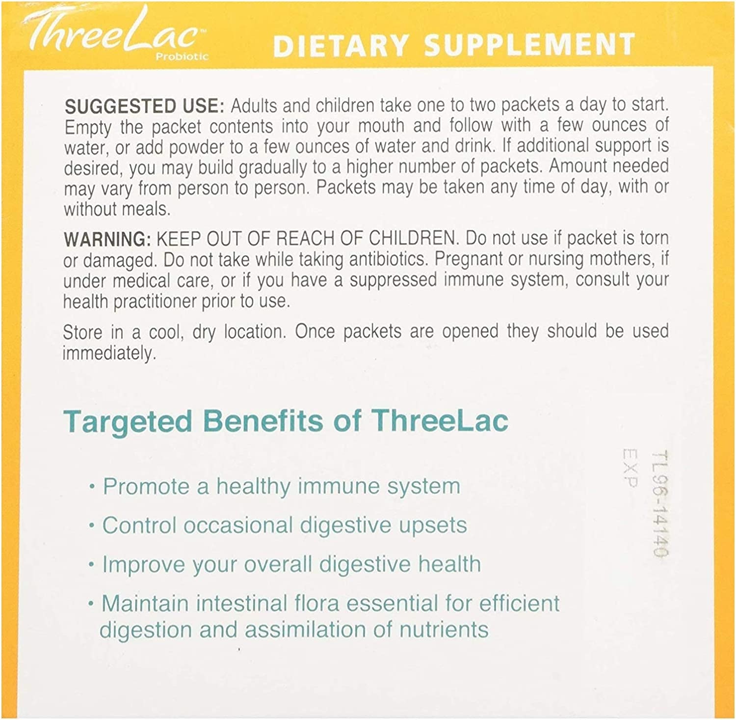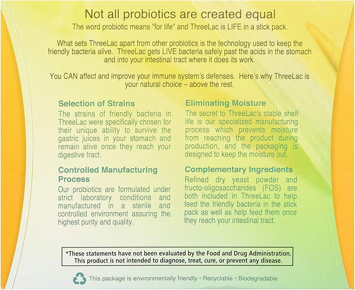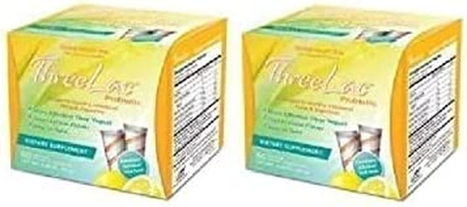 2 Boxes of Threelac. For over a decade, this superior product has provided selected beneficial microflora to the intestinal tract to promote intestinal health. Packaged in individual sachets with a pleasant lemon taste, Threelac fits into your active lifestyle. ThreeLac is a powerful probiotic formulation of three potent microflora in a lemon-powder base.