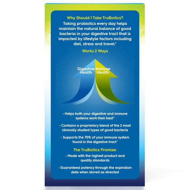 TruBiotics, Daily Probiotic Supplement for Digestive Health, Men and Women, 30 Capsules. Most individuals don't get enough good bacteria from their diet alone. Certain factors including stress, age, diet, travel, and sleep can disrupt the balance of friendly bacteria in the digestive tract. In order to help maintain this balance, it's important to take a probiotic supplement that helps to replenish the good bacteria. Taking a quality probiotic supplement like TruBiotics can help you proactively maintain good digestive, immune system, and overall health.