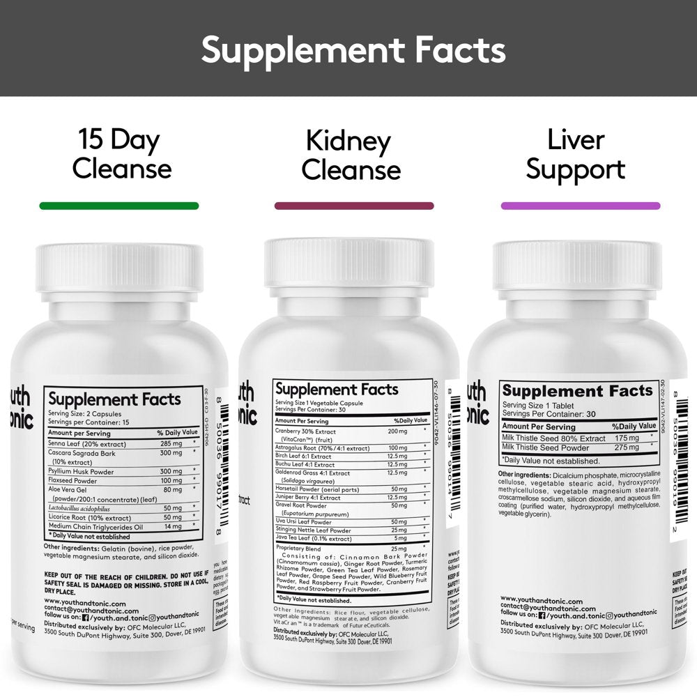 15 Day Cleanse: Senna Leaf; Cascara Sagrada Bark; Psyllium Husk Powder; Flaxseed Powder; Aloe Vera Gel; Lactobacillus Acidophilus; Licorice Root; Medium Chain Triglycerides Oil. Kidney Cleanse: Cranberry 30% Extract; Astragalus Root; Birch Leaf Powder; Buchu Leaf Powder; Goldenrod Grass Powder; Horsetail Powder; Juniper Berry Powder; Gravel Root Powder; Uva Ursi Leaf Powder; Stinging Nettle Leaf Powder; Java Tea Leaf; Proprietary Blend: Cinnamon Bark Powder; Ginger Root Powder; Turmeric Rhizome Powder; Green Tea Leaf Powder; Rosemary Leaf Powder; Grape Seed Extract; Wild Blueberry Fruit Powder;Red Raspberry Fruit Powder; Cranberry Fruit Powder; Strawberry Fruit Powder. Liver Support: Milk Thistle Seed 80% Extract; Milk Thistle Seed Powder./div>