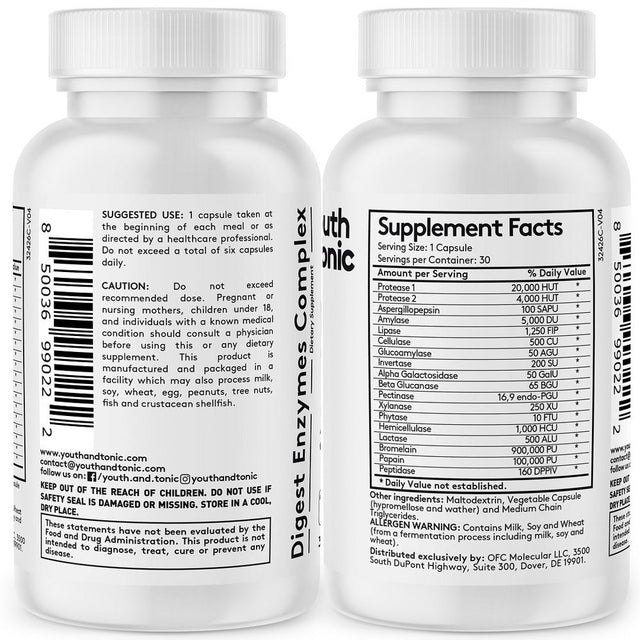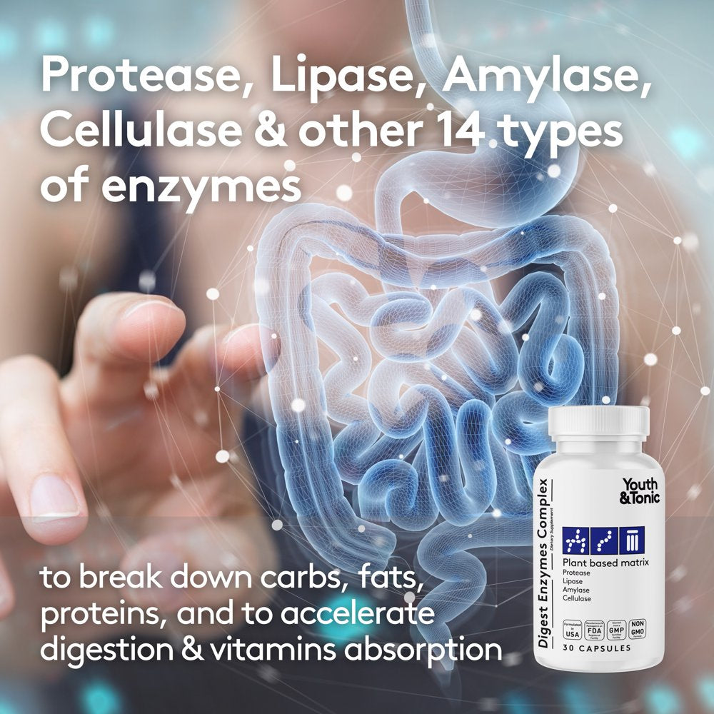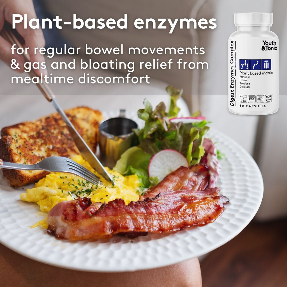 Youth & Tonic Digest Enzymes Complex, Plant Based Matrix for Digestive Health, 30 Capsules