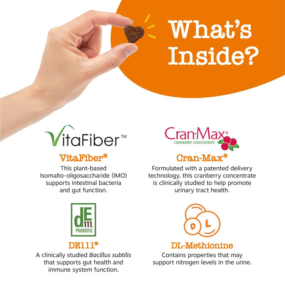Active Ingredients: DL-Methionine Hydroxy Analogue, Isomalto-oligosaccaride (VitaFiber™), Digestive Health Blend (Protease, Amylase, Lipase, Cellulase, Papain, Hemicellulase, Bromelain), Apple Cider Vinegar, Cranberry Concentrate (CranMax®), Bacillus Coagulans, Bacillus Subtilis (DE111®). Inactive Ingredients: Brewer’s Yeast, Chicken, Coconut Glycerin, Flaxseed, Garbanzo Flour, Mixed Tocopherols (a preservative), Natural Chicken Flavoring, Natural Flavor (from Oregano, Flaxseed and Plum), Palm Oil, Pea Flour, Powdered Cellulose, Rosemary Extract, Sunflower Lecithin, Tapioca Flour./div>