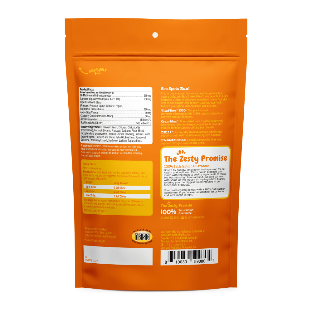This functional chewable dog supplement features Cran-Max® (cranberry concentrate) with antioxidants that are clinically studied to help support urinary tract health. Zesty Paws Stay Green Chicken-Flavored Bites include sixty lawn protector chewables that get to the source of grass burn caused by dog urine to help your lawn go from burned to beautiful, while also providing digestive and bowel support.