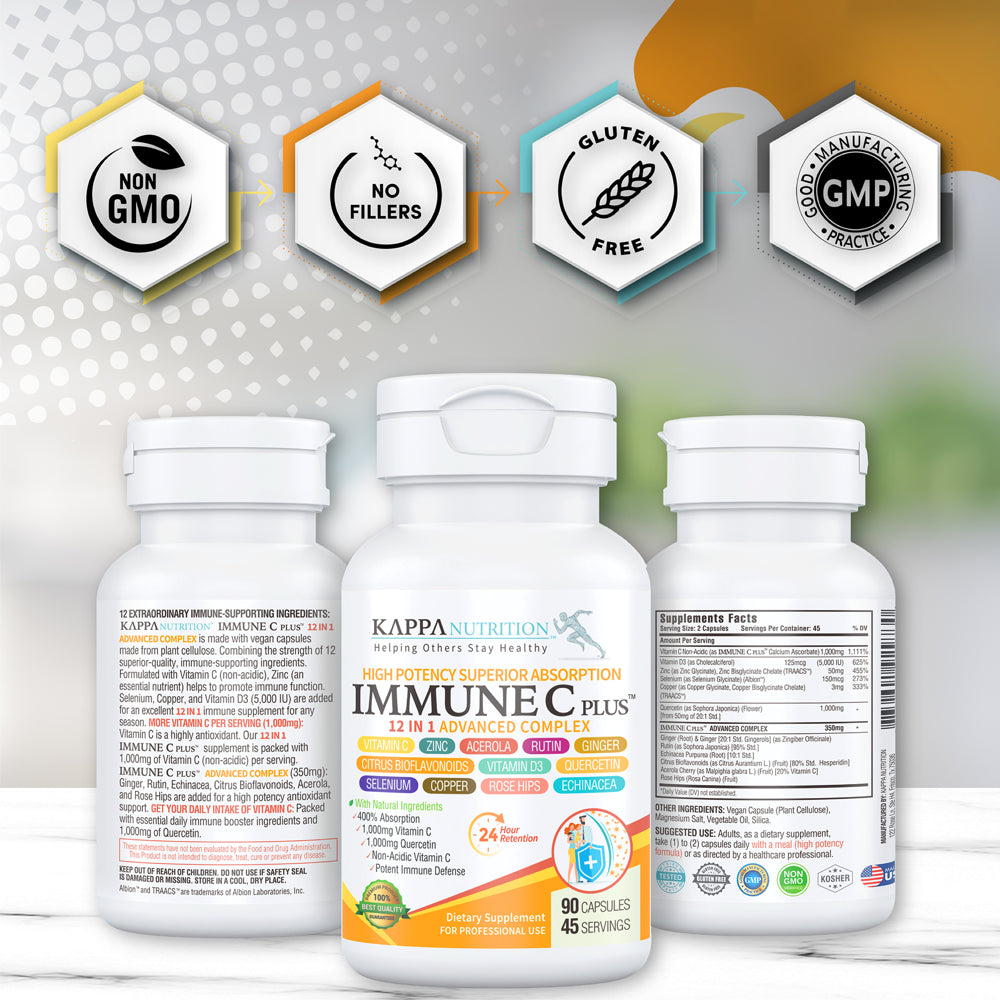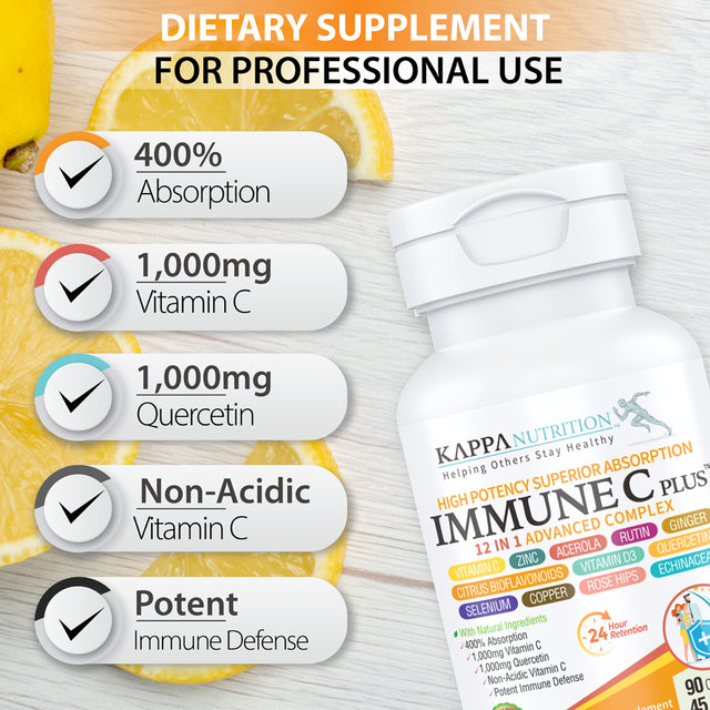 - Kappa Nutrition ultrapure immunity boost defense formula features 12 ingredients, vitamin C non-acidic + Zinc + Vitamin D3 + Acerola + Ginger + Rutin + Bitter Orange + Rose Hips + Copper + Selenium + Quercetin + Echinacea, to help strengthen the body’s defenses to keep you protected year-round with extra immunity support. Promotes antioxidant activity: Kappa Nutrition Immune C Plus has powerhouse antioxidant ingredients to help fight off free radicals that can damage cells and immune health