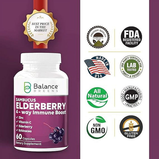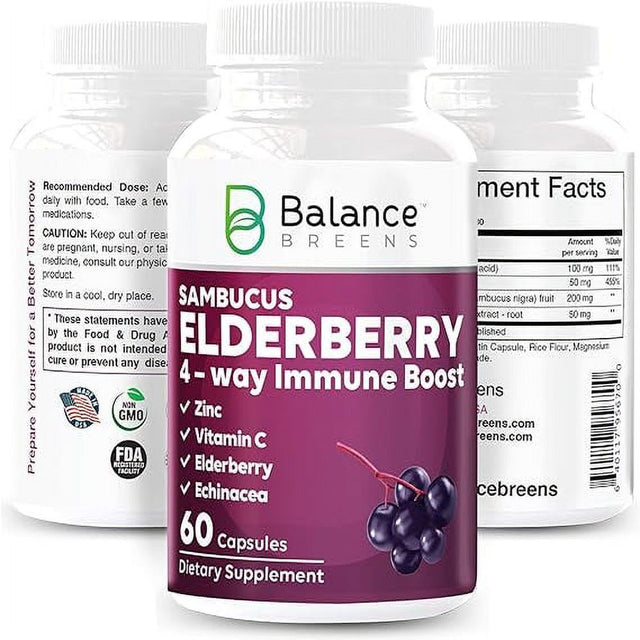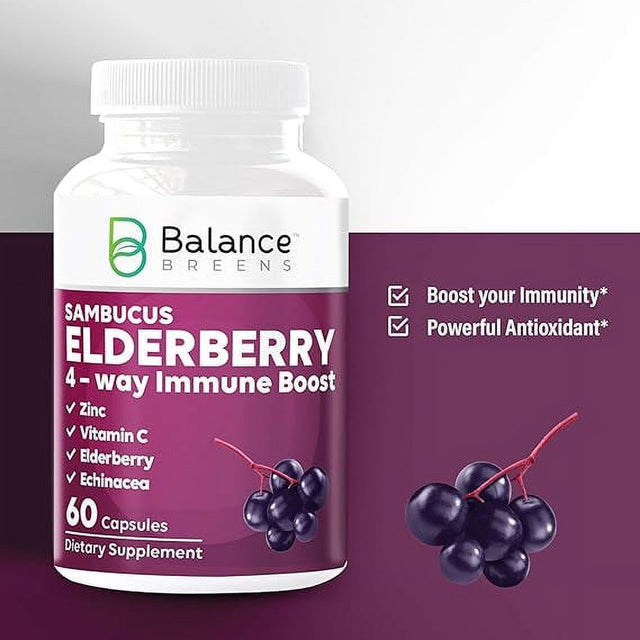 Balance Breens Sambucus Elderberry Extract - 4 Way Immune Support with Elderberry, Vitamin C, Zinc, Echinacea - Powerful Antioxidant - 60 Count
