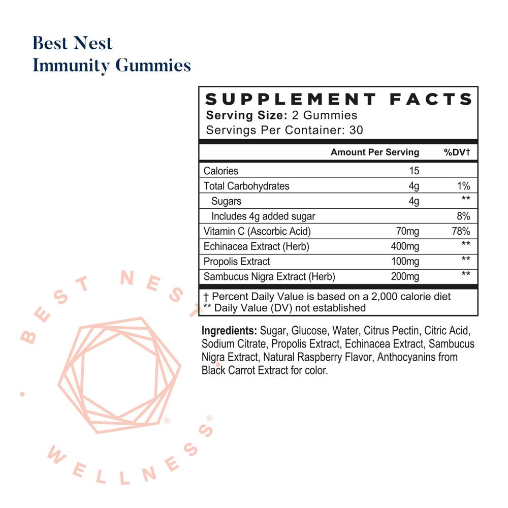 - Best Nest Immunity Gummies combine vitamin C, propolis, echinacea, and elderberry - antioxidants, vitamins, and herbs that are known to support immunity and sustain wellness.