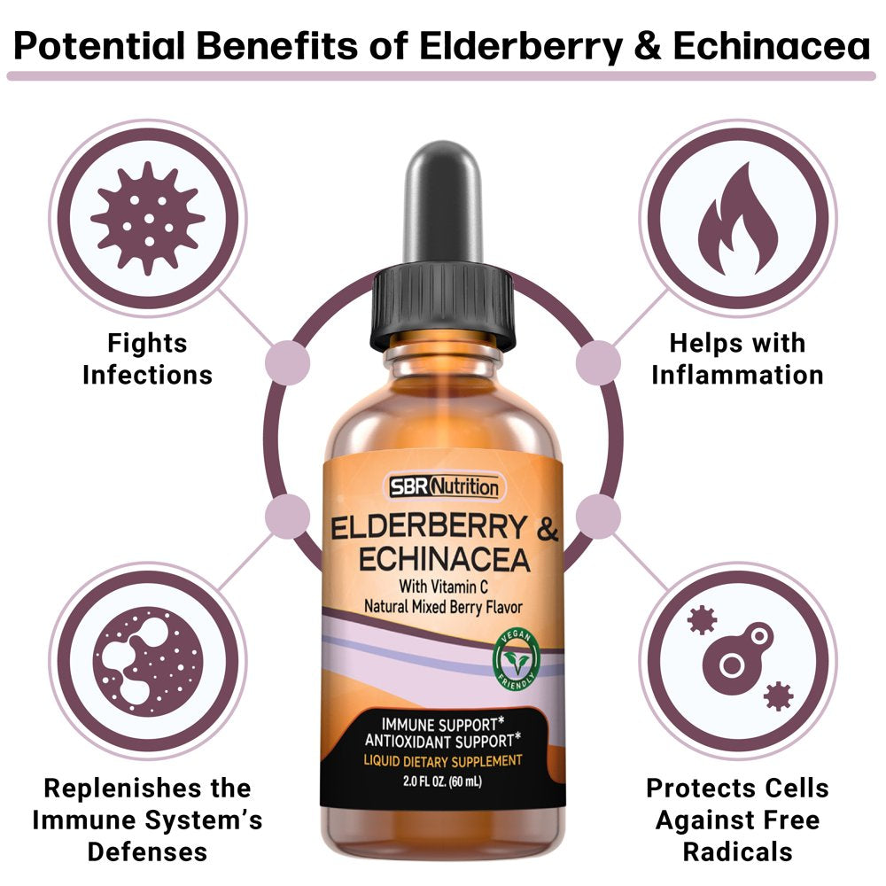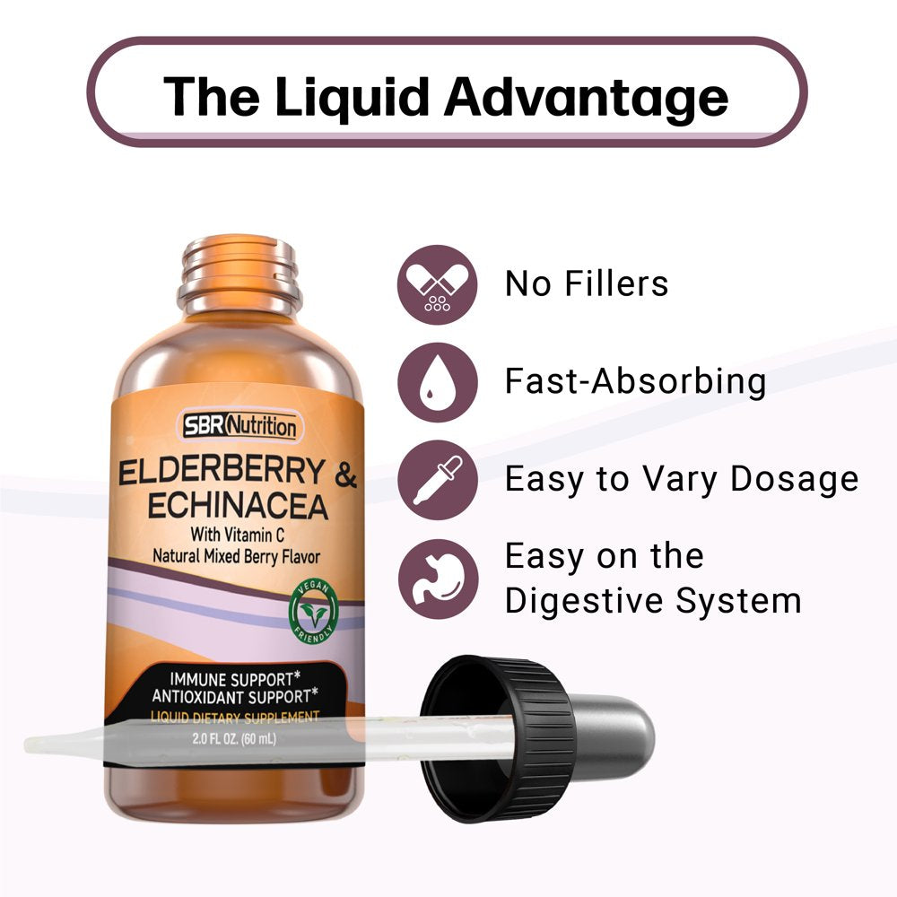 SBR Nutrition Immune Support Liquid Dietary Supplement for Adults, Elderberry and Echinacea with Vitamin C, Organic, Vegan Sambucus Extract Immune System Booster, 2 oz (60 mL)