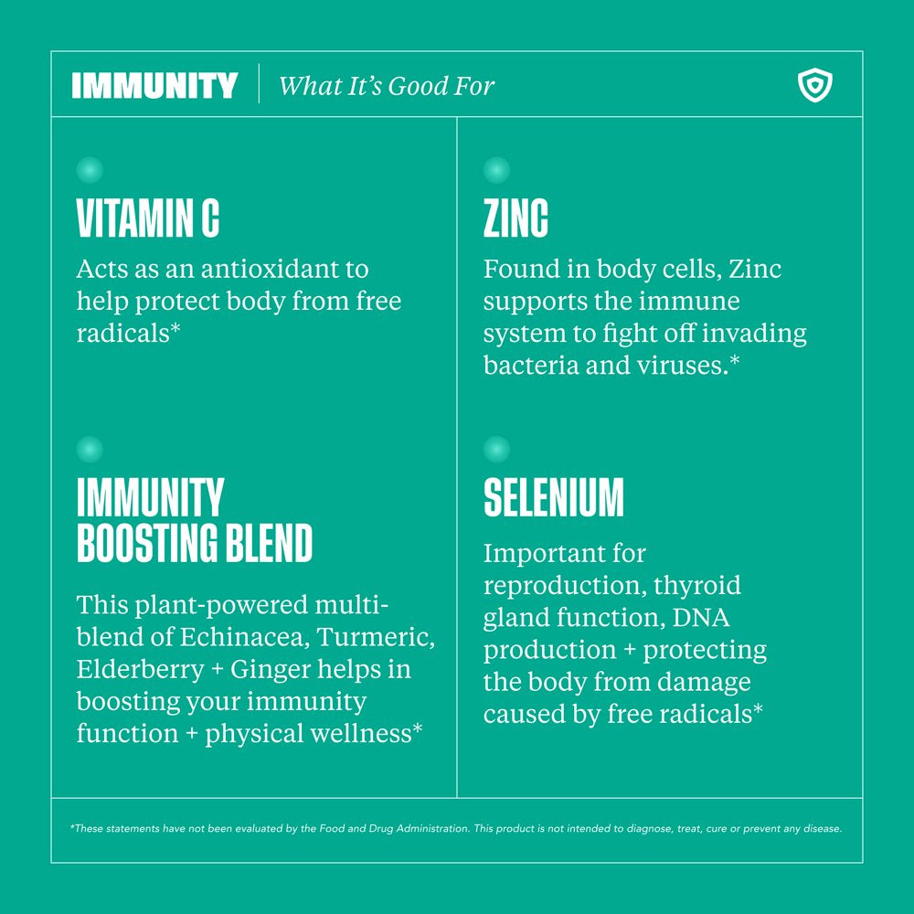 Master the art of self-defense with our specialized Immunity blend, shown to support antioxidant levels* and immune health*. With Vitamin C, Zinc and Selenium, plus an Immunity Boosting Blend that includes Echinacea, Turmeric, Ginger, Elderberry and Cordyceps, you’ll have your guard up in no time. With no artificial colors, flavors or sugar, Immunity is vegan, non-GMO and designed, formulated and manufactured in California. Contains 30 servings per pack. For full instructions, see back of pack. Discover the power of habit and #DOITDAILY MVP ingredients Vitamin C Zinc Echinacea Turmeric Ginger Cordyceps Elderberry the Power of Habit at Health By Habit we know maintaining your health is hard enough, so we don’t overcomplicate it. We’re democratizing wellness by making products that are affordable, accessible and straight-forward. That do what they say on the label. To do that, we consult a research and development team of scientists and nutritionists, with decades of experience and a wealth of knowledge. With Health By Habit, you get clever, concentrated formulas that work incrementally to make you feel like yourself… but better. Because we know you’ve got bigger things to achieve, we make it easy to get it done daily and get on with your life. *These statements have not been evaluated by the Food and Drug Administration. This product is not intended to diagnose, treat, cure or prevent any disease.