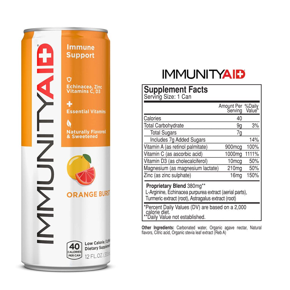 1000mg Vitamin C + Only the good stuff, none of the junk—to fortify your immune system daily The ImmunityAid Support Blend contains key ingredients and supplements like Echinacea, Zinc, Vitamins A, C & D3, Magnesium & Astragalus Root to help keep your immune system boosted and firing on all cylinders Turmeric (to help reduce swelling from travel and everyday stress) Each can is only 40 calories, naturally sweetened with just 9g of raw organic blue agave Lightly carbonated, with a refreshing "Orange Boost" taste Jam-packed with clean, quality nutrients and supplements your mind and body need to function optimally & Stay defended year-round