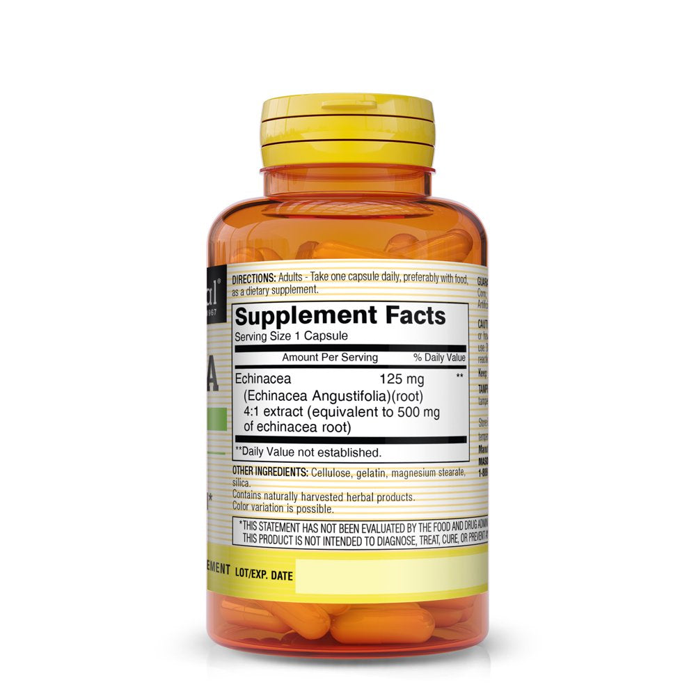 - Our echinacea formula is concentrated to contain the equivalent of 500 mg of echinacea root per capsule which may support the immune system when exposed to bacteria and viruses. Guaranteed to have no added sugar, starch, sodium, yeast, soy, corn, wheat, dairy, fish, tree nuts, peanuts, egg, fragrance, artificial colors or flavors, preservatives, crustacean