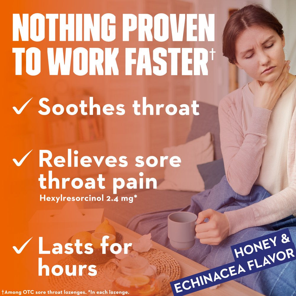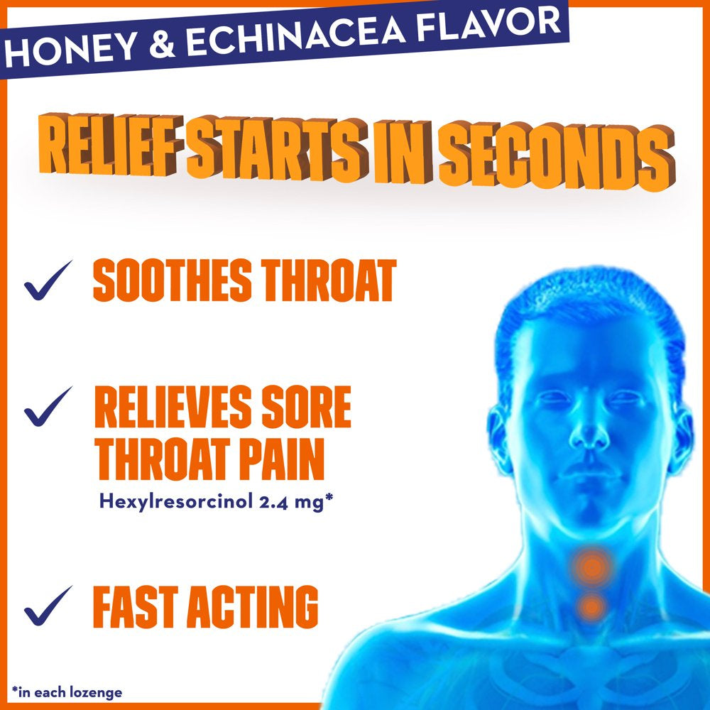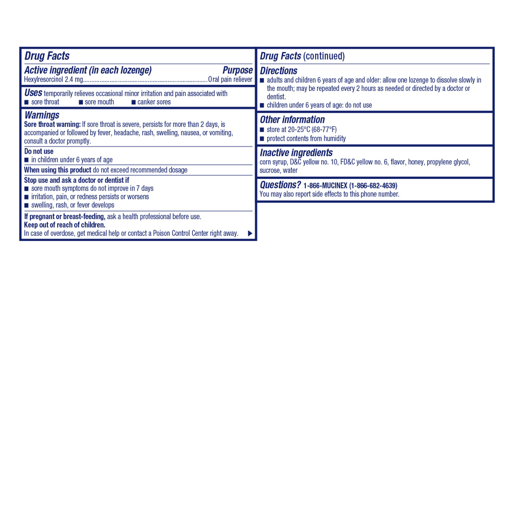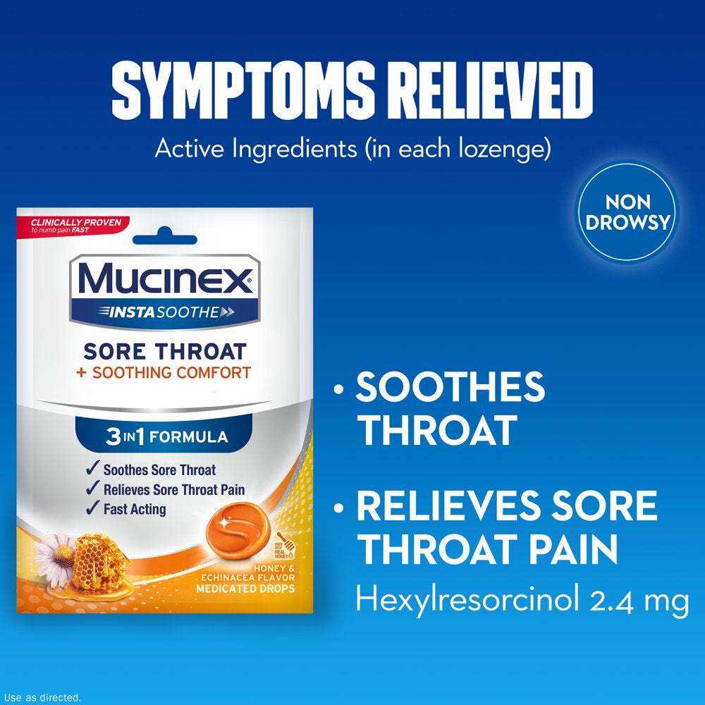 - CLINICALLY PROVEN TO NUMB PAIN FAST: Take the sting out of your sore throat with fast acting, Mucinex InstaSoothe Sore Throat + Soothing Comfort Honey & Echinacea Flavor 3-in-1 medicated drops. Made with Real Honey!