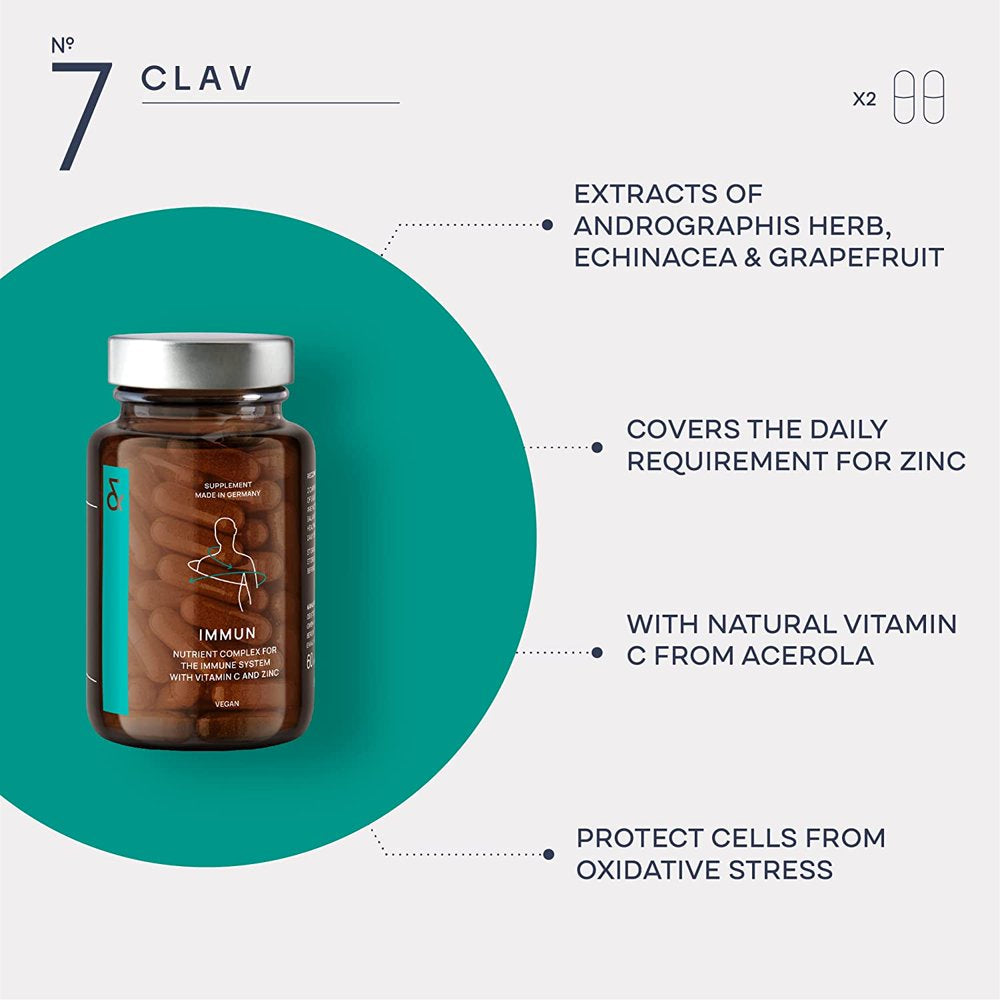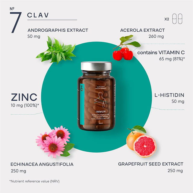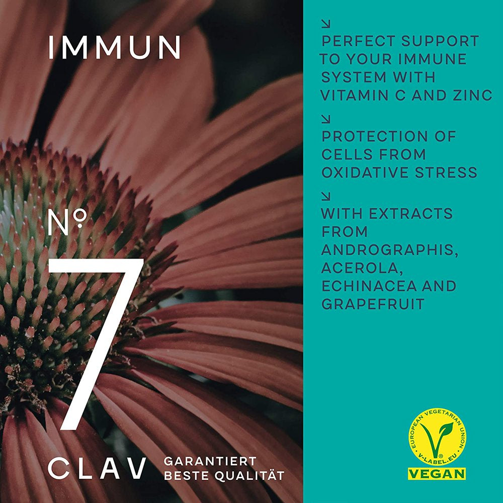 N°7 Immune is a high-quality dietary supplement to support the immune system in a particularly powerful combination with high-dose vitamin C from acerola extract and zinc citrate, as well as other powerful components such as andrographis herb extract, echinacea angustifolia, L-histidine and grapefruit seed extract.