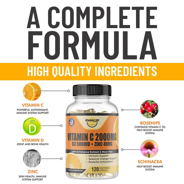 Vitamin C 2000MG, Zinc 40 Mg, Vitamin D3 5000 IU, Echinacea Extract, Rose Hip, Immune Support for Adults Kids, Immune Booster,120 Vegan Capsules, 60 Day Supply, Non GMO, No Filler, No Stearate