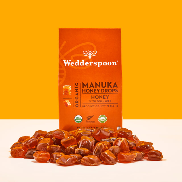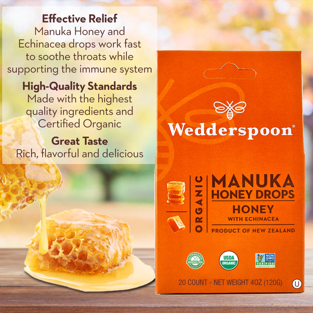 Soothe throats with this time-tested recipe still crafted with care in small batches. Perfect for the common cold and allergy season. Wedderspoon's Manuka Honey Drops are a refreshing and invigorating flavor for your sore throat. Wedderspoon organic manuka honey drops are hand crafted in New Zealand with care in small batches to provide you with a natural remedy to a cold, flu, dry mouth, throat or allergy ailment combined with immunity boosting support. Our dual action drops use soothing organic manuka honey combined with Echinacea, which have naturally-occurring wellness properties and are most often used to boost the immune system. Each box contains 20 slow dissolving drops. USDA Organic, Gluten-free, dairy-free, nut-free, and GMO-free. Sourced, packed and labeled in New Zealand for genuine, unadulterated quality. Each box contains approximately 20 drops. Handmade in small batches with genuine, organic manuka honey. Never bitter or medicinal tasting. Glyphosate free. No artificial coloring, flavoring or preservatives.