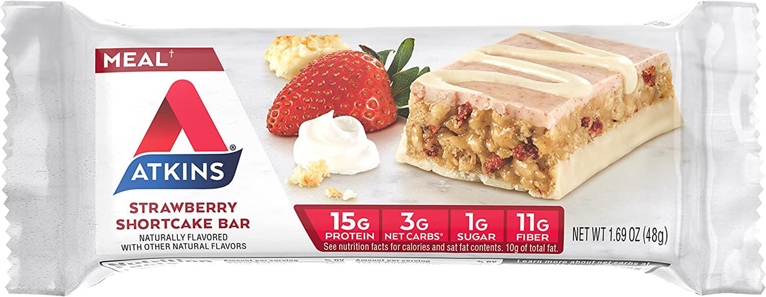 - AT HOME OR ON-THE-GO. Atkins Strawberry Shortcake Protein Meal Bars. Enjoy delicious meal bars that fit right into your busy schedule, with 15g of protein, 1g of sugar, and 3g of net carbs per serving*. This is Today’s Atkins.