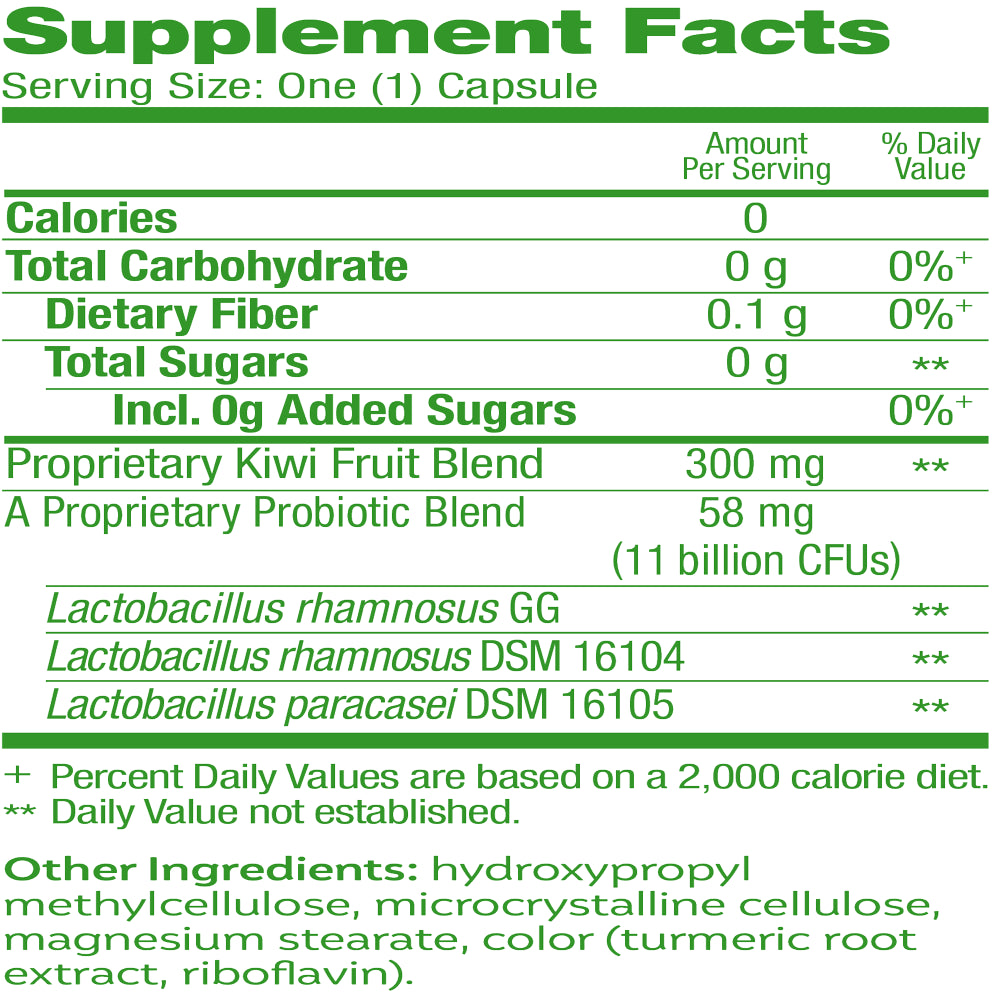 hydroxypropyl methylcellulose, microcrystalline cellulose, magnesium stearate, color (turmeric root extract, riboflavin), Proprietary Kiwi Fruit Blend, Lactobacillus rhamnosus GG, Lactobacillus rhamnosus DSM 16104, Lactobacillus paracasei/div>