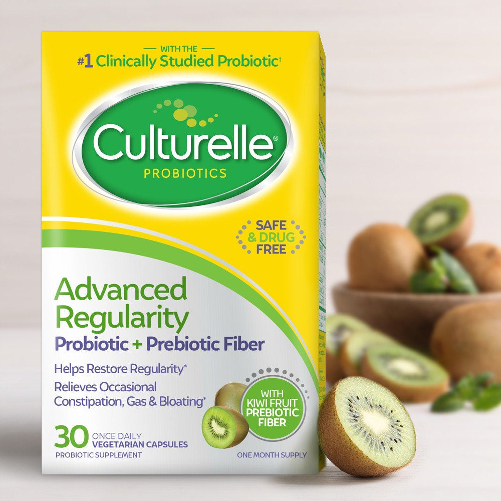 Culturelle® Advanced Regularity Probiotic + Prebiotic Fiber Capsules help your digestive system work better and support your gut microbiome. Your gut microbiome works to support an overall healthy you because it's linked to your digestive health, cognition, mood, nutrition, and immune system. Formulated with three clinically proven probiotic strains and a prebiotic fiber naturally sourced from kiwi fruit, these probiotic capsules help restore regularity and relieve occasional digestive issues like constipation, gas, and bloating.* Adopt Culturelle® Probiotics as a new habit to maintain a healthy, balanced microbiome and to support your lifelong health.*