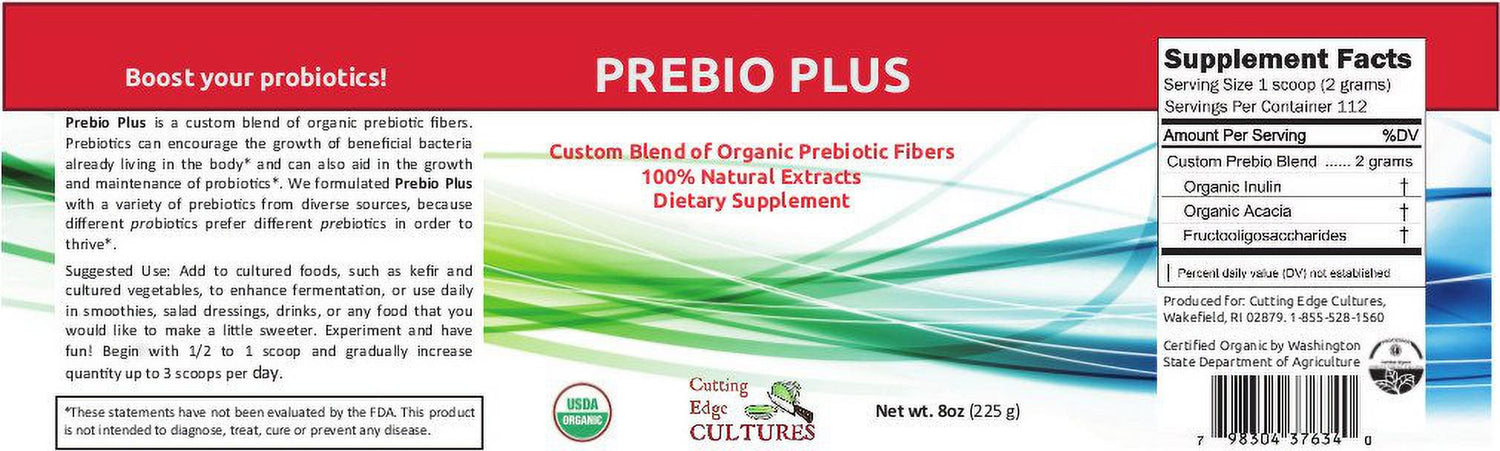 Cutting Edge Cultures Prebio Plus Prebio Plus is a custom blend of organic prebiotic fibers. Prebiotics can encourage the growth of beneficial bacteria already living in the body and can also aid in the growth and maintenance of probiotics. Prebio Plus is Easy to Use. Add Prebio Plus to: Any food or beverage, hot or cold. Kefir or cultured veggies while they're culturing. You can even add it after they're done for an extra boost. Your kefir to make it super creamy. If your kefir has over-separated Prebio Plus helps to make it creamy again. Salad dressing or condiments such as kombucha mayo or kefir cheese for an added probiotic boost. Your morning coffee or tea. Start your inner bacteria off to a running start at the beginning of the day! Baked goods. Or just sprinkle it on top of salads or even toast & jam. Prebio Plus is Food for Your Bacteria Prebio Plus has three different strains of prebiotics, making it three times as effective as other prebiotics on the market today. If you're trying to get healthy, then probiotic foods can make a world of difference. Adding a prebiotic (which is food for you bacteria,) will make the good bacteria grow like crazy and super charge your probiotics. Prebiotics are just as important as probiotics, and you should use them together. Prebiotics naturally reside in all kinds of fruits, vegetables, and some nuts & other foods. However, we found some of the strongest sources of prebiotics and placed them in an easy to use powder form. Suggested Use Add to cultured foods, such as kefir and cultured vegetables, to enhance fermentation, or use daily in smoothies, salad dressings, drinks, or any food that you would like to make a little sweeter. Experiment and have fun! Begin with 1/2 to 1 scoop and gradually increase quantity up to 3 scoops per day.