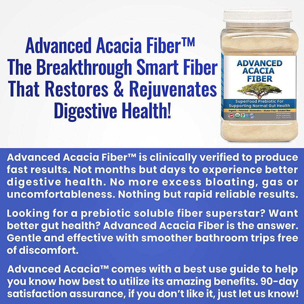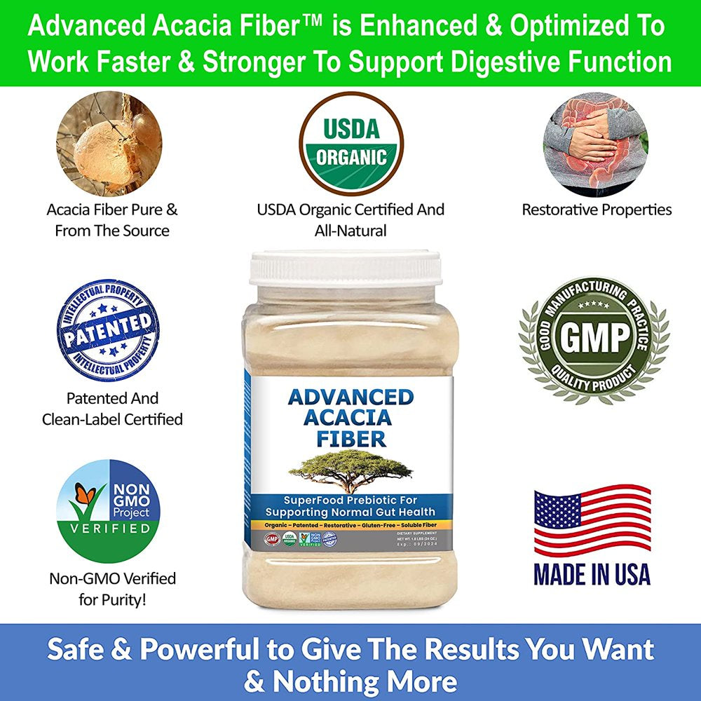 Our one-of-a-kind 100% soluble acacia fiber powder supports gut repair and good digestive health like no other acacia powder available. Our scientifically verified acacia fiber AKA gum arabic powder is the premiere acacia fiber to support restoration of gut health with a prebiotic effect that clinically grows more probiotics, produces a healthy gut environment, supports normal gas, bowel movements & overall digestive wellness. 1.5 lb. jar. This advanced fiber supplement powder supports elimination of bad stuff in the gut, regulates bowel health & supports GI leaky gut. Advanced Acacia Fiber is a soluble fiber clinically substantiated for optimal gut health. More soluble fiber means more gut repair. 30-50 grams per day, factually substantiated with no negatives. Accomplish any digestive health goal with Advanced Acacia Fiber.