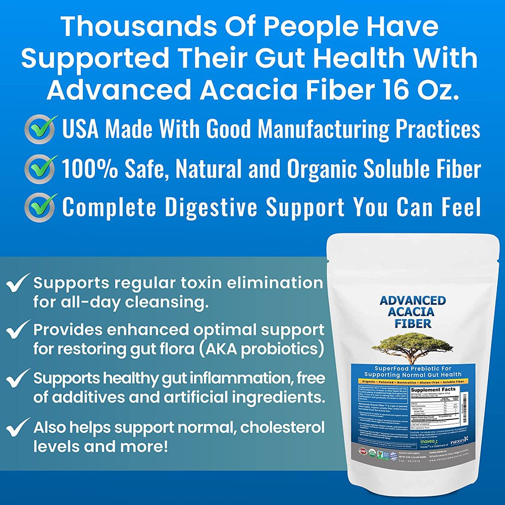 Our one-of-a-kind 100% soluble acacia fiber powder supports gut repair and good digestive health like no other acacia powder available. Our scientifically verified acacia fiber AKA gum arabic powder is the premiere acacia fiber to support restoration of gut health with a prebiotic effect that clinically grows more probiotics, produces a healthy gut environment, supports normal gas, bowel movements & overall digestive wellness. 1 lb. bag. This advanced fiber supplement powder supports elimination of bad stuff in the gut, regulates bowel health & supports GI leaky gut. Advanced Acacia Fiber is a soluble fiber clinically substantiated for optimal gut health. More soluble fiber means more gut repair. 30-50 grams per day, factually substantiated with no negatives. Accomplish any digestive health goal with Advanced Acacia Fiber.