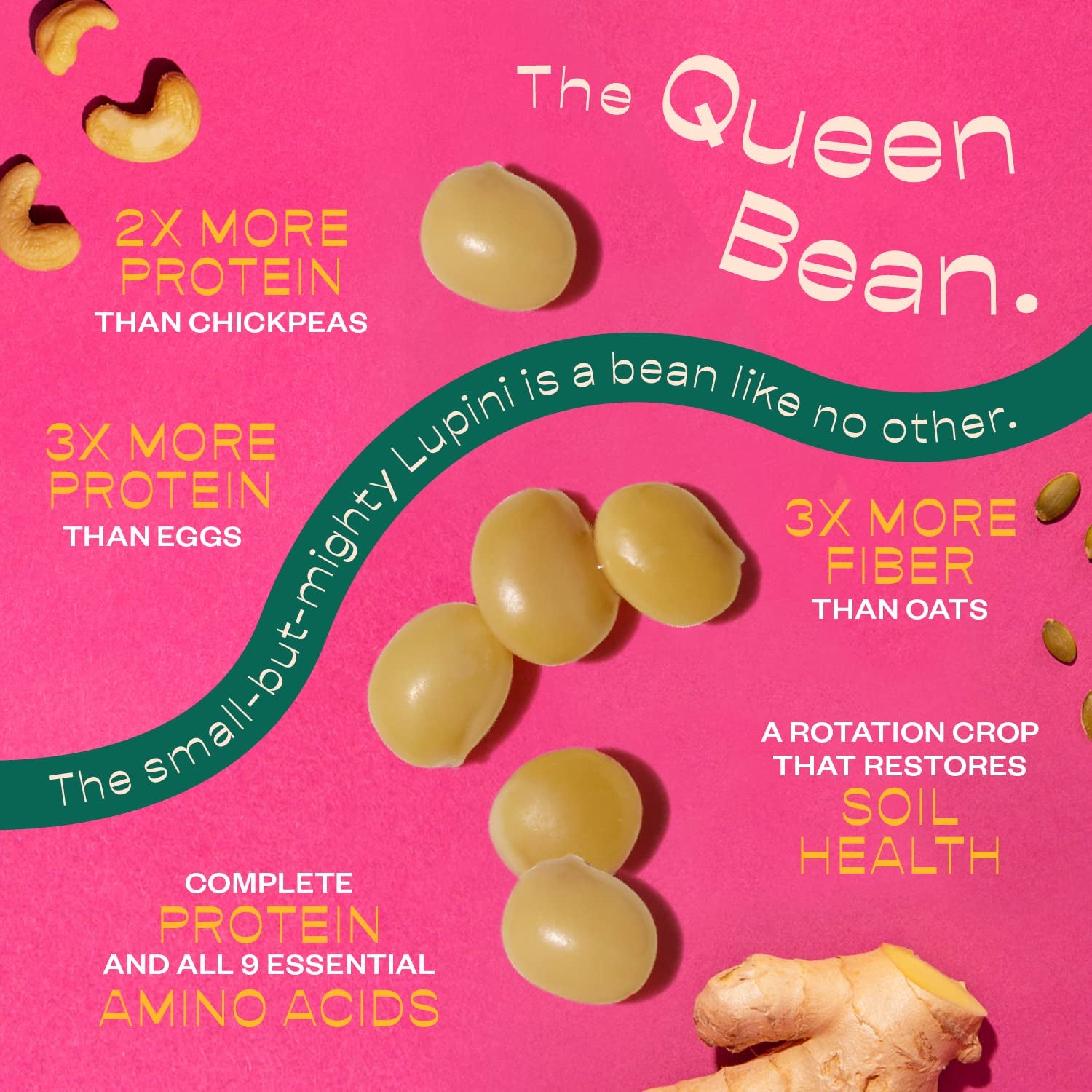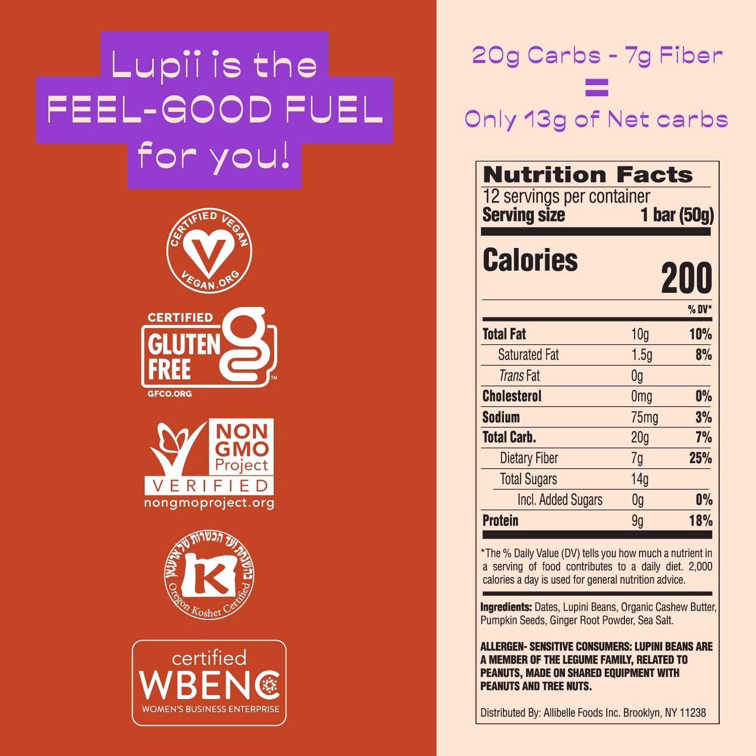 - Sustainable & Functional Protein Snack - The hero ingredient of our cashew ginger pumpkin seed bar is the new protein in town! A high-fiber legume that has 2x more protein than chickpeas and 3x more than eggs, Lupini beans are also packed with vitamins & minerals, plus they're good for the earth too; as they need less water than their plant protein counterparts.