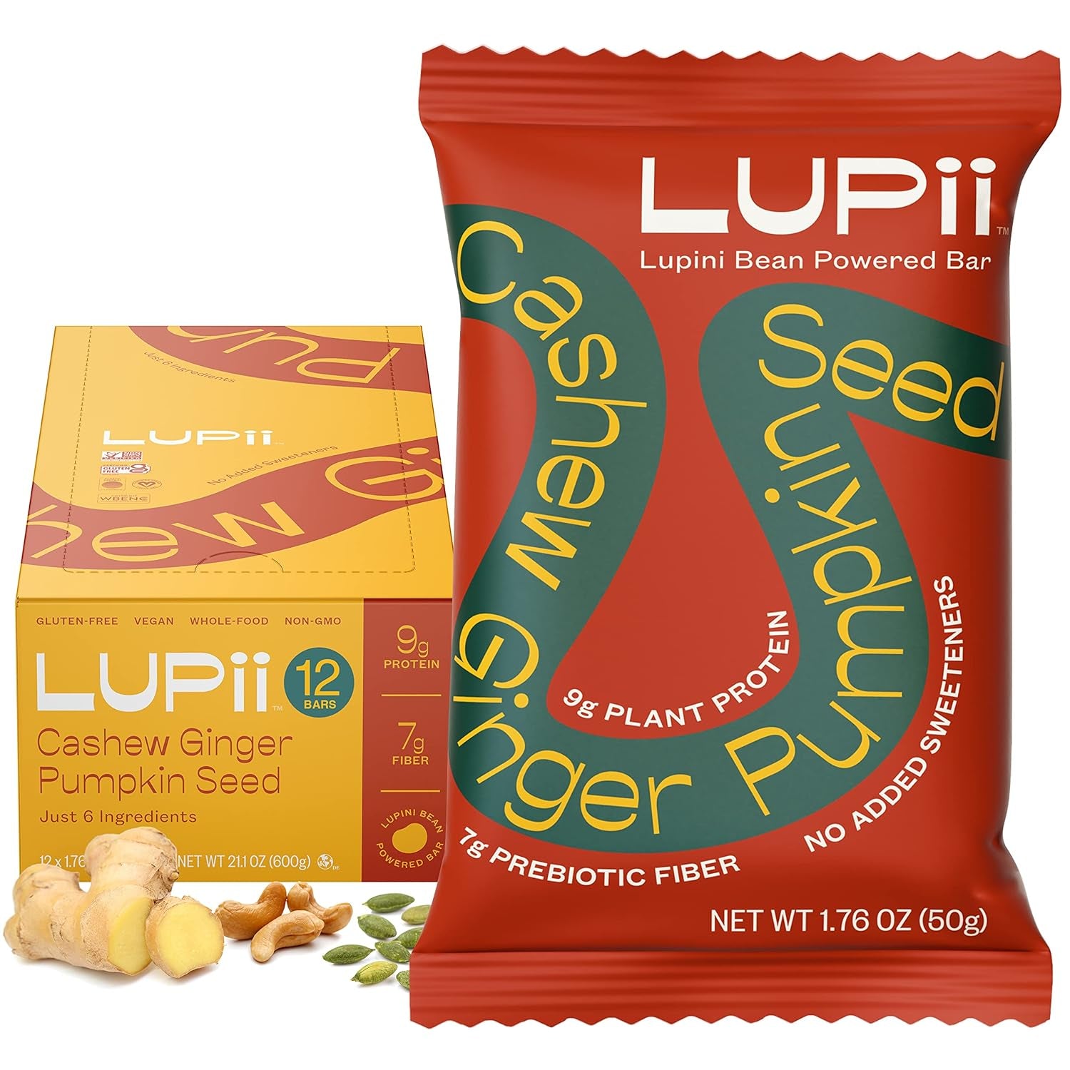 - Lupini Bean-Powered Bars - Delivering 9g of clean protein and 7g prebiotic fiber in each serving, Lupii gives you the future of vegan snacks, packed with the function of regular protein snacks & food bars. These cashew ginger pumpkin seed protein bars are made plantiful--all thanks to the small-but-mighty Lupini bean.