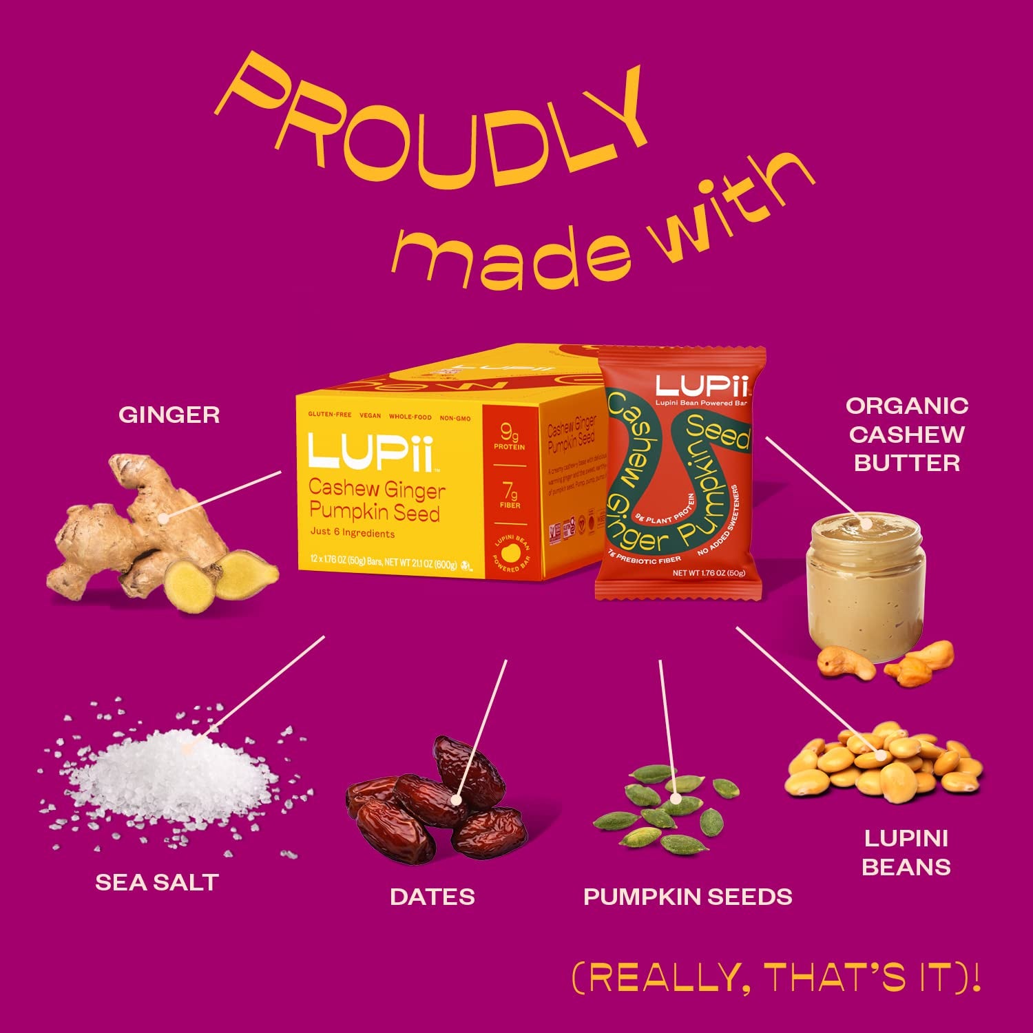 - Clean Protein Bars with Just 6 Ingredients - Lupii vegan protein bars are made only with a handful of whole food ingredients you want and nothing you don't. Aside from the queen lupini bean, our tasty protein bites are made with dates, organic cashew butter, pumpkin seeds, ginger root powder, and sea salt for a rich source of fiber, potassium, magnesium, iron, and vitamin B6.