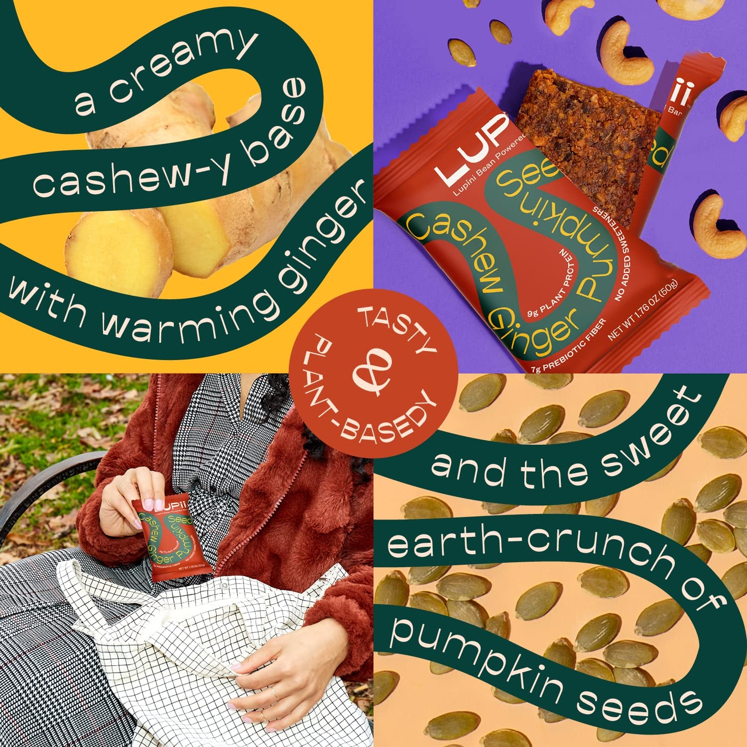 - Tasty + Plant-Basedy Cashew Ginger Pumpkin Seed Bites - Pump, pump, pump it up and swap your old breakfast bars, energy bars, or nutrition bars with this Lupii bar. A creamy cashew-y base with delicious, warming ginger and the sweet, earthy-crunch of pumpkin seed.