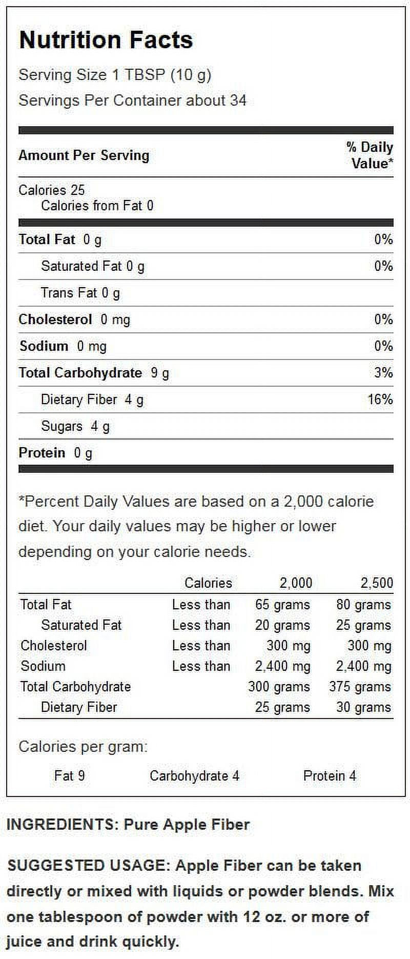 Now Foods Apple Fiber Powder - 12 oz. (340 g) Supplement Facts Serving Size: 1 Tablespoon (10 g) Servings Per Container: 34 Amount Per Serving %DV Calories 40 Total Fat 0 g 0% Saturated Fat Trans Fat 0 g0 g 0% Cholesterol 0 mg 0% Sodium 0 mg 0% Total Carbohydrates 9 g 3% Dietary Fiber 5 g 18% Sugars Includes 0g Added Sugars 2 g 0% Protein 0 g Vitamin D 0 mcg 0% Calcium 8 mg 0% Iron 0.2 mg 2% Potassium 54 mg 2% *The % Daily Value (DV) tells you how much a nutrient in a serving of food contributes to a daily diet. 2,000 calories a day is used for geeral nutrition advice. Other Ingredients: Pure Apple Fiber Not manufactured with yeast, wheat, gluten, soy, milk, egg, fish, shellfish or tree nut ingredients. Produced in a GMP facility that processes other ingredients containing these allergens./div>