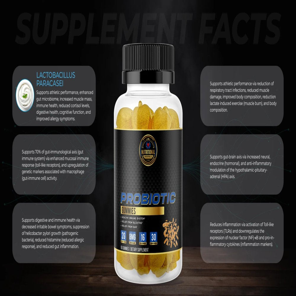 - Probiotic Gummies Probiotic Gummies is a delicious efficacious gummy formula that supports athletic performance, enhanced gut micro biome, increased muscle mass, immune health, reduced cortisol levels, digestive health, cognitive function, oral health, immune health, and improved allergy symptoms.*