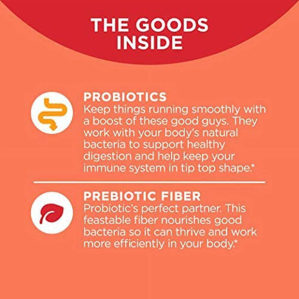 OLLY PROBIOTIC + PREBIOTIC: These chewable adult probiotics deliver a powerful combination of live Probiotics and Prebiotic Fiber to help keep your natural flora and digestion balance Product Note: Exposure to heat or sunlight may lead to melting/damage of product. Hence customers are expected to be available during the product delivery THE GOODS INSIDE: 500 million CFU of Bacillus Coagulans work with your body's natural bacteria to support a healthy digestive tract and immune system. Prebiotics nourishes your good bacteria so it can thrive and work more efficiently in your body HOW TO TAKE: Chew one gummy daily, no food or water needed NATURALLY DELICIOUS: These probiotic prebiotic gummies come in naturally flavored Peachy Peach with no artificial colors or flavors and are gluten free. 30 gummies per bottle (30 day supply) MIX AND MATCH: Delightful and delicious OLLY gummies can be taken together—mix and match as you please