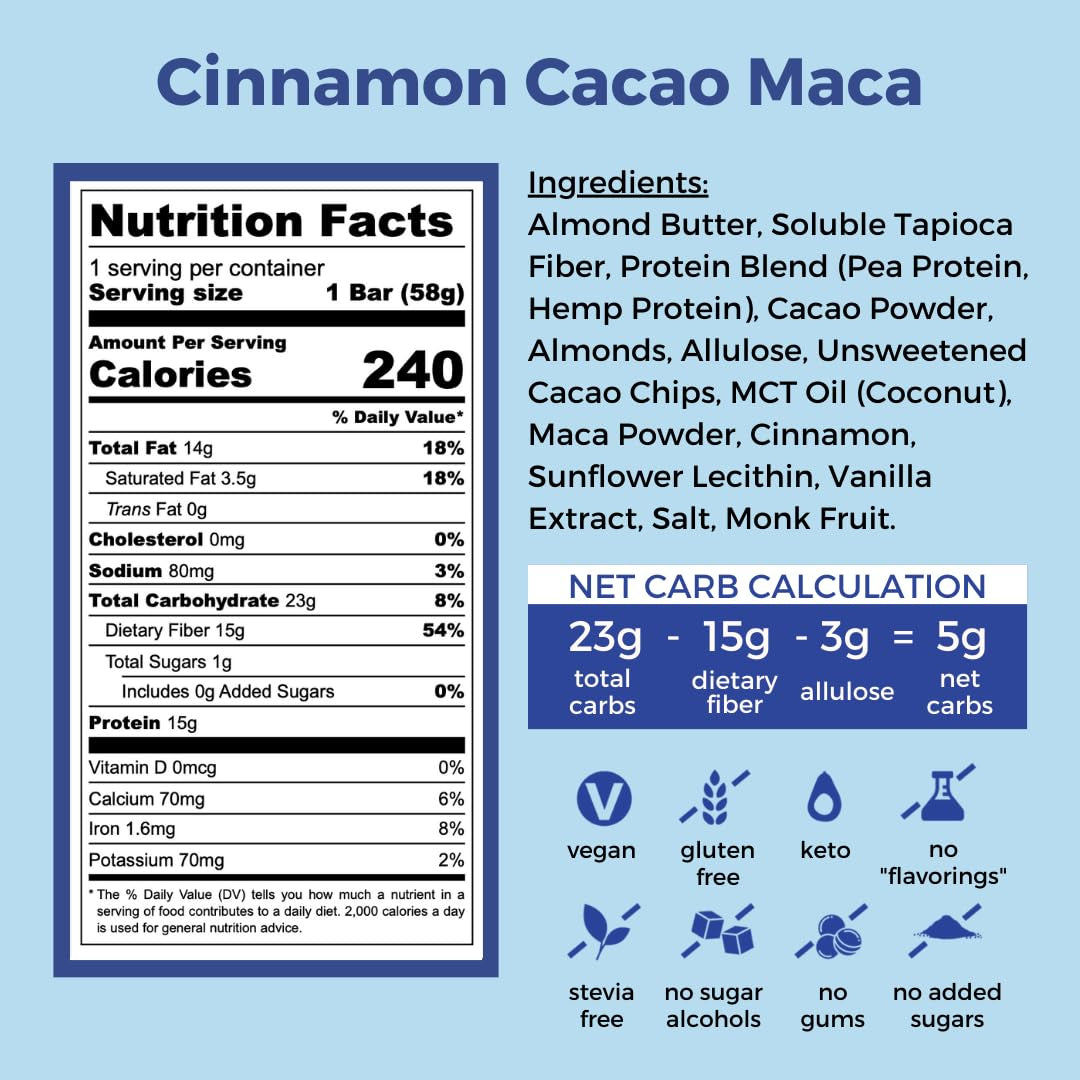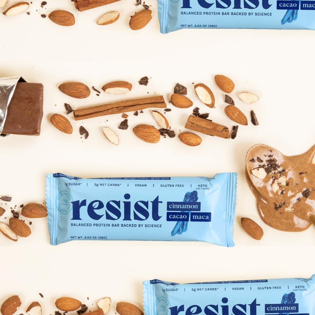 Resist Low Glycemic Protein Bars - Cinnamon Cacao Maca | Clinically-Backed, High Fiber Keto Vegan Bars, Low Sugar, Gluten-Free, Low Carb, No Stevia, No Sugar Alcohols (58G, 12 Count)