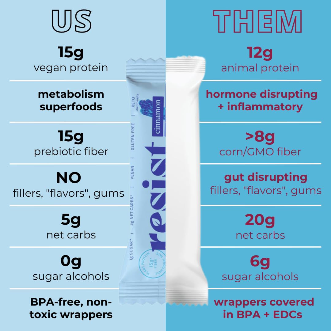 - 🧘 Keto Friendly Snacks w/ 3-4g Net Carbs: Our low carb protein bars make Resist bars friendly for a keto diet and a low carb diet.