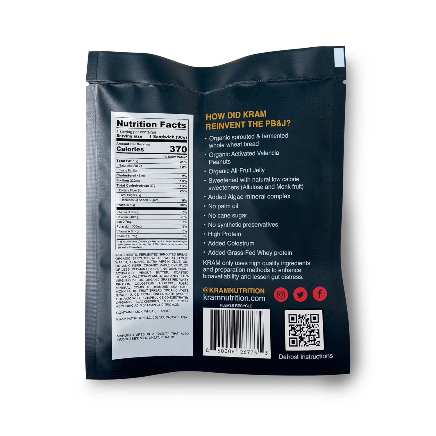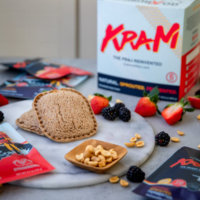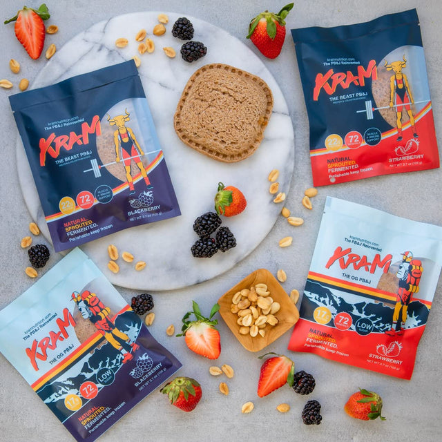 - HEALTHY SNACKING: KRAM PB&J's are optimized for athletes and healthy living. We soak the peanuts to make them easier on the gut, sprout and ferment the wheat to reduce gluten and other compounds that may be hard on the gut, we include healthy fats to support vitamin absorption/cellular structure. KRAM PB&J's are high in slow burning carbs that will help sustain your glycogen/blood glucose levels.