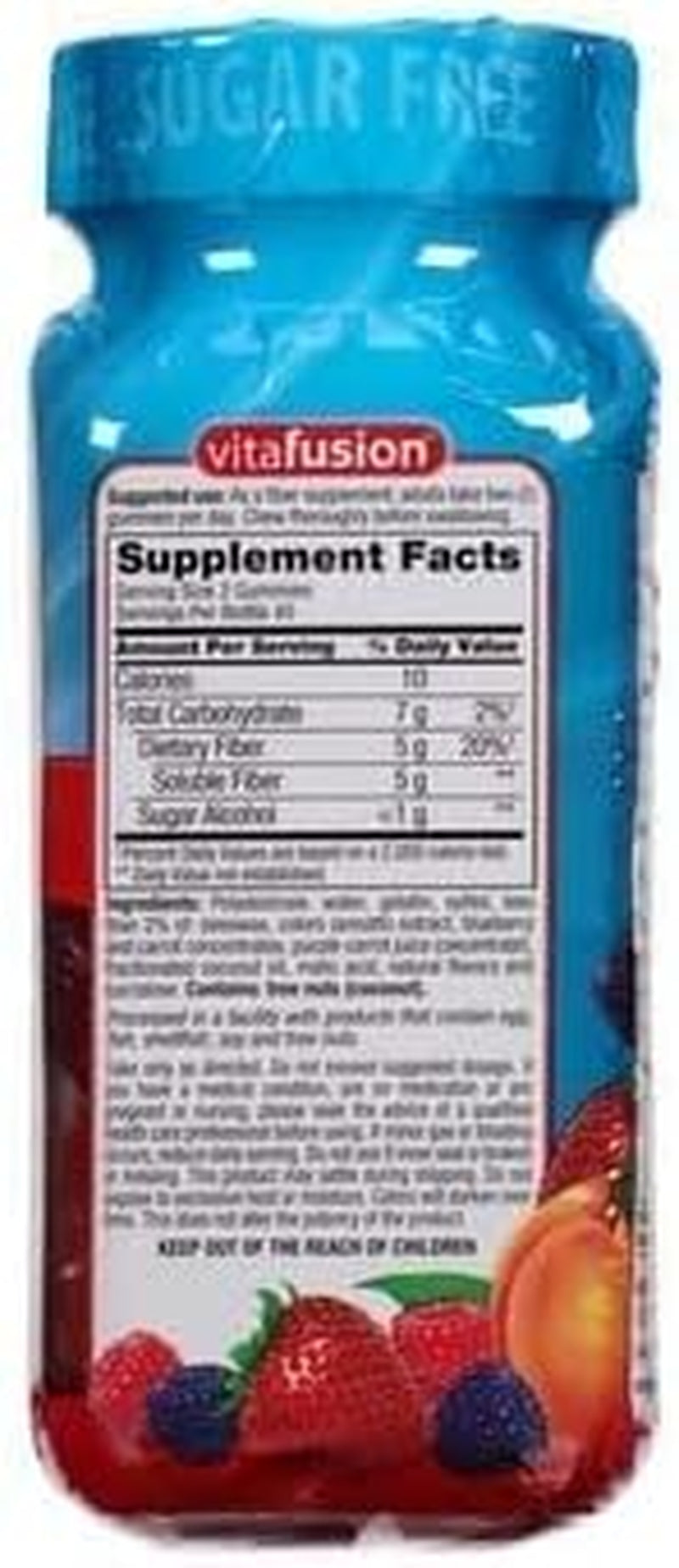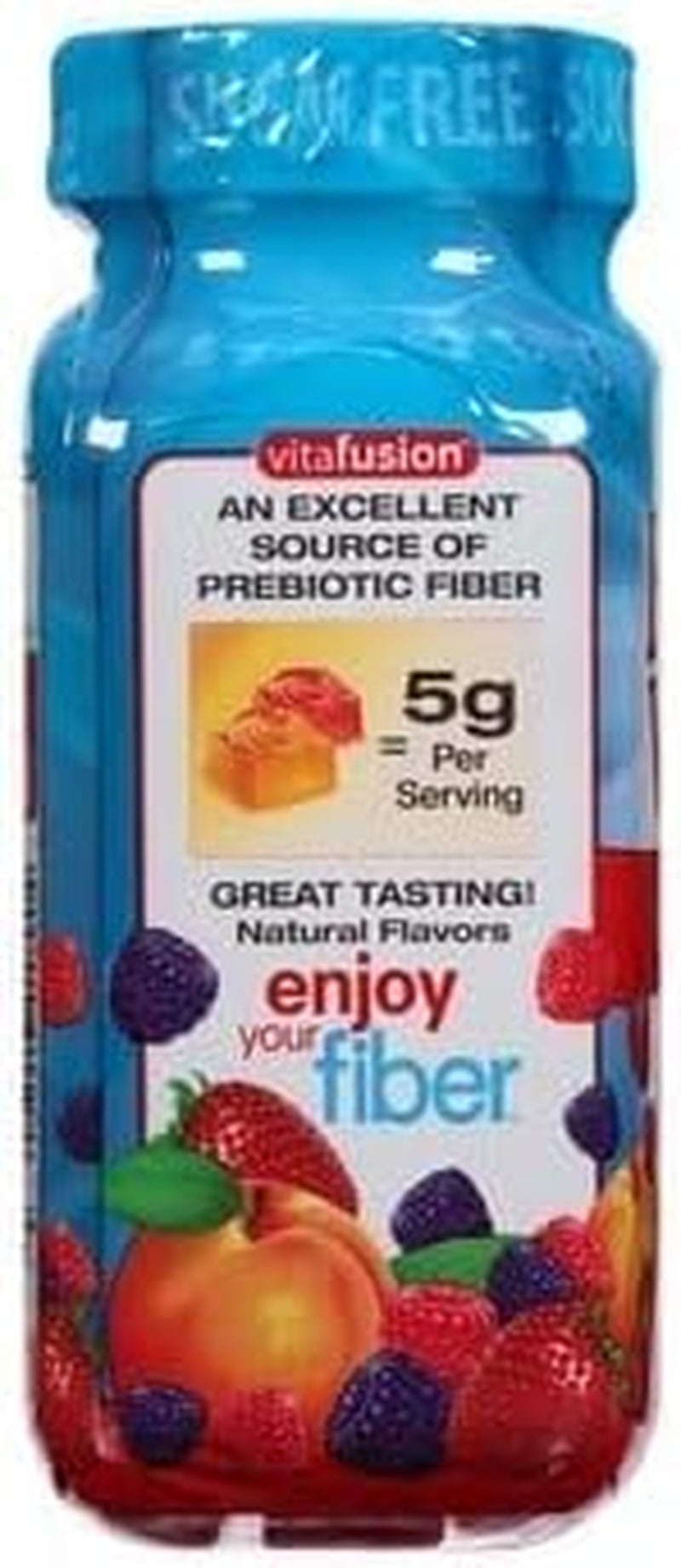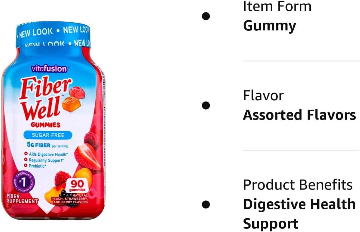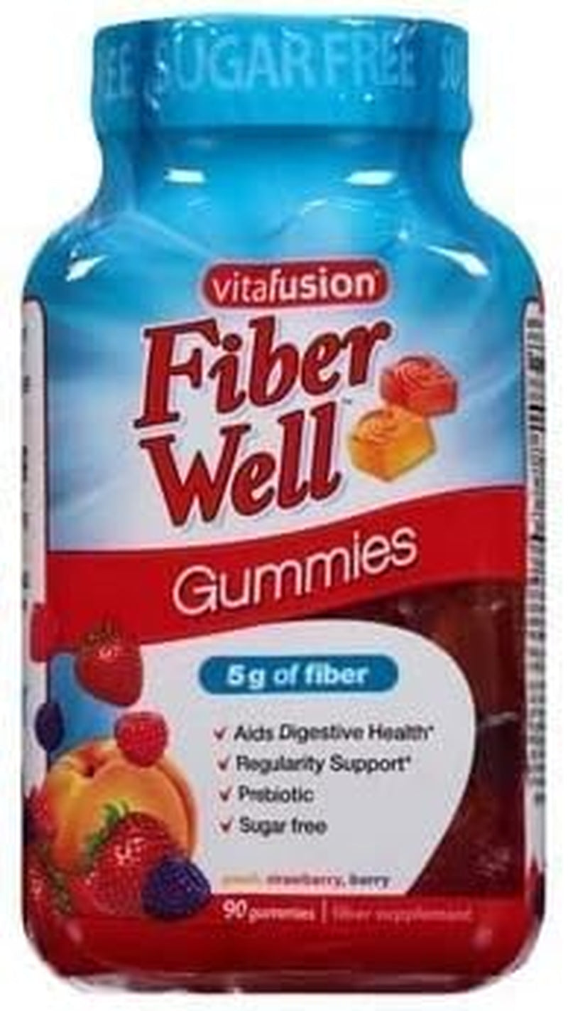 Vitafusion Fiber Well gummies help you get the fiber you may need to support digestive health with 5 grams of prebiotic fiber in each delicious, sugar-free gummy serving. Vitafusion Fiber Well gummies come in three delicious natural fruit flavors - peach, strawberry, and blackberry, so you can enjoy your fiber.