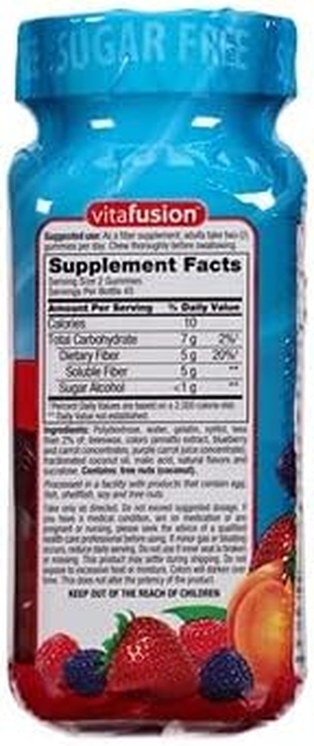 Vitafusion Fiber Well gummies help you get the fiber you may need to support digestive health with 5 grams of prebiotic fiber in each delicious, sugar-free gummy serving. Vitafusion Fiber Well gummies come in three delicious natural fruit flavors - peach, strawberry, and blackberry, so you can enjoy your fiber.