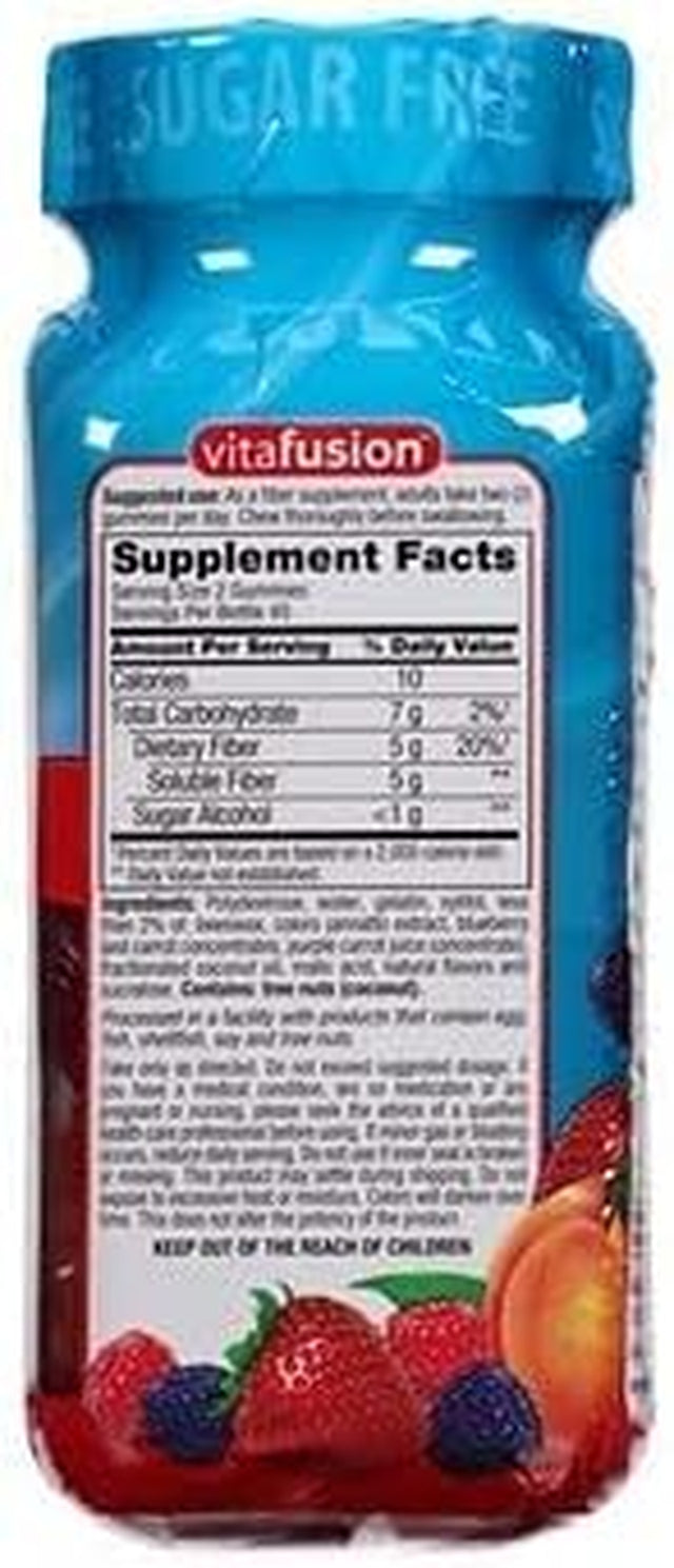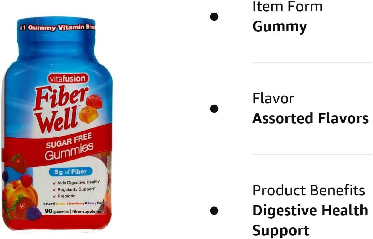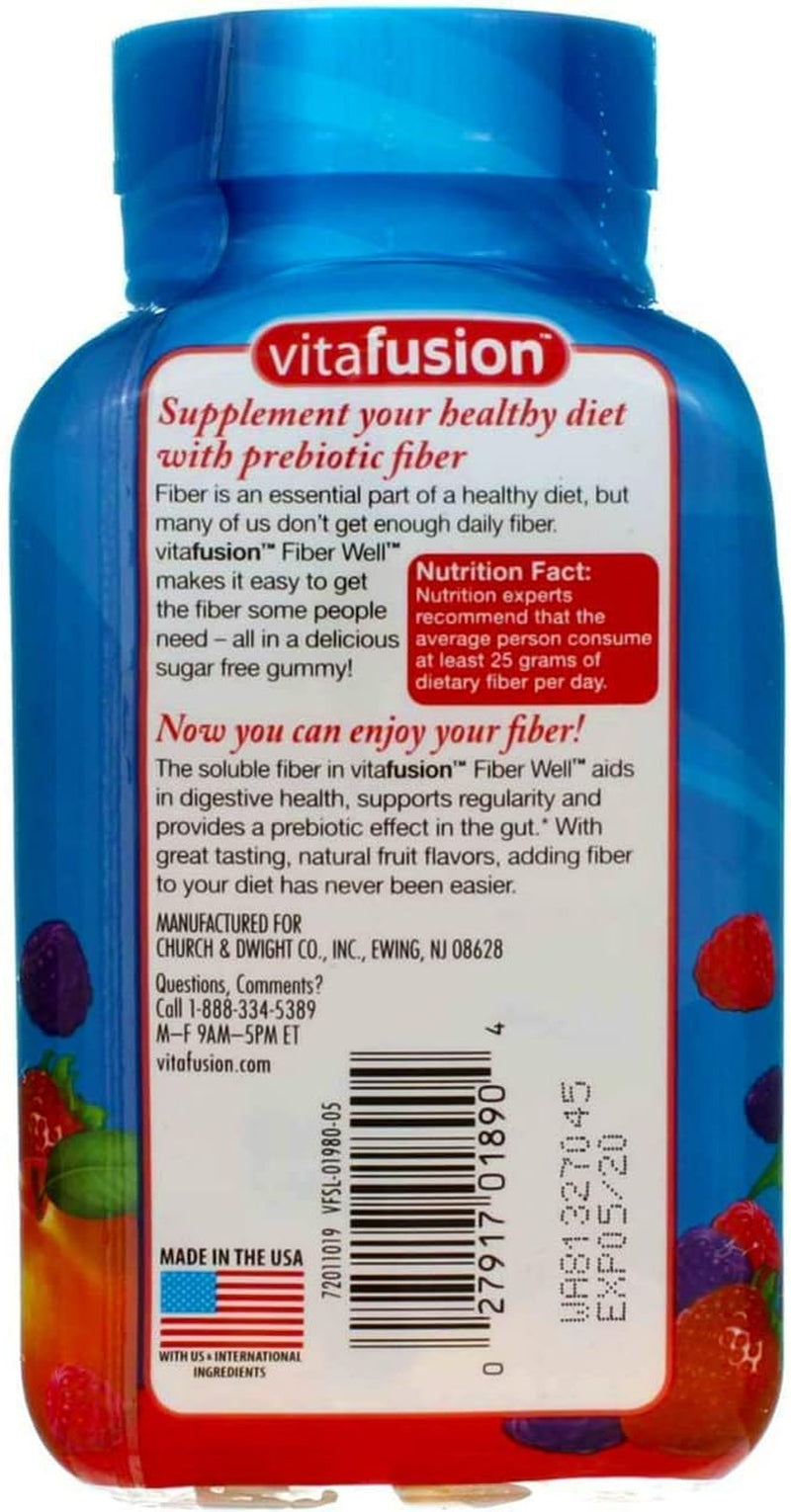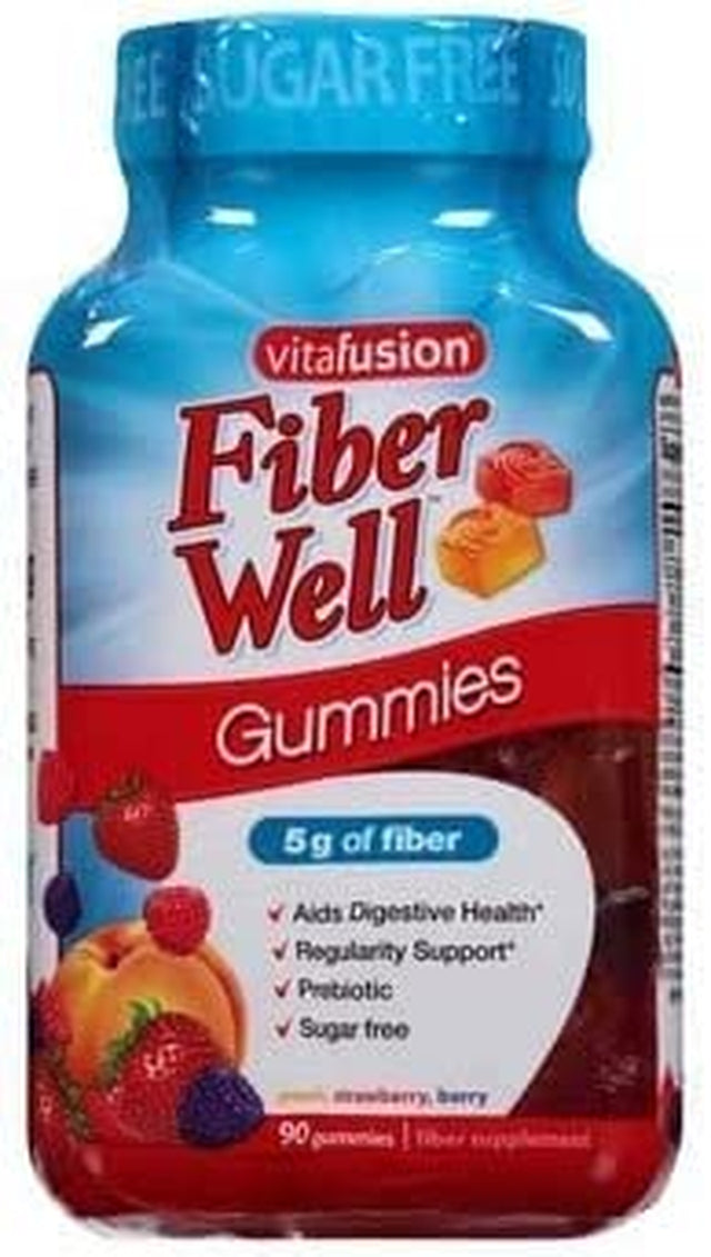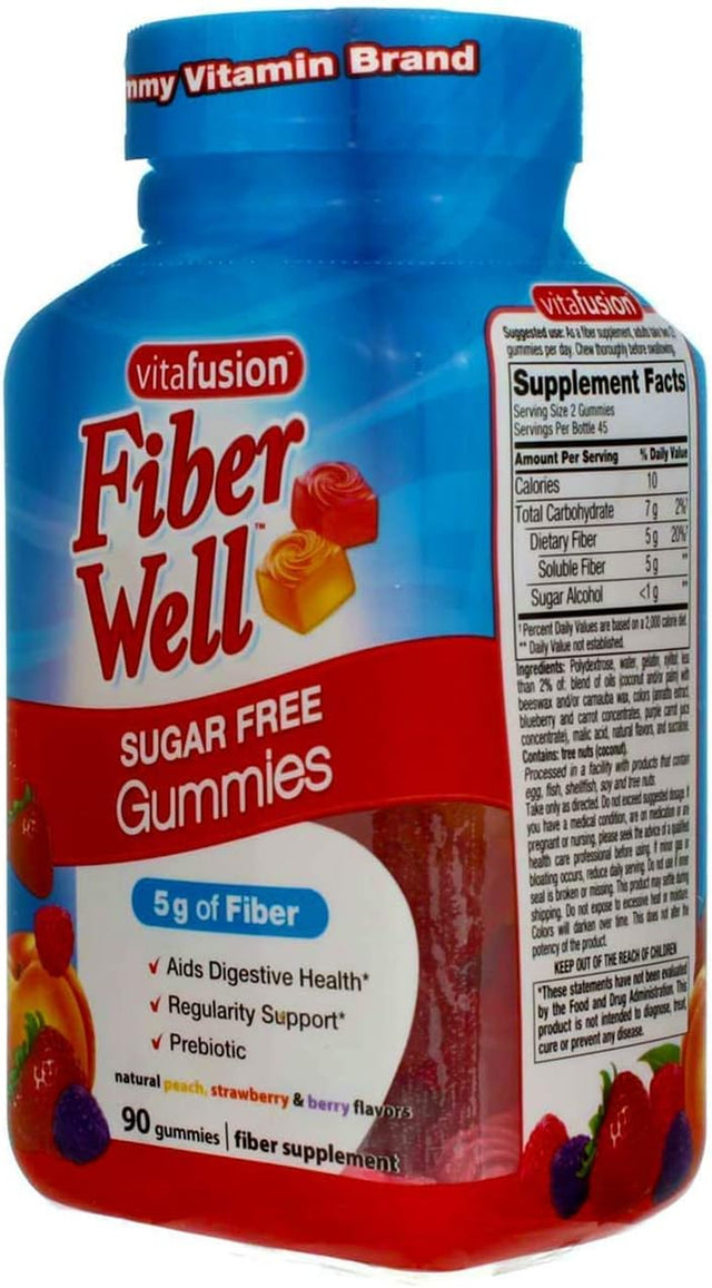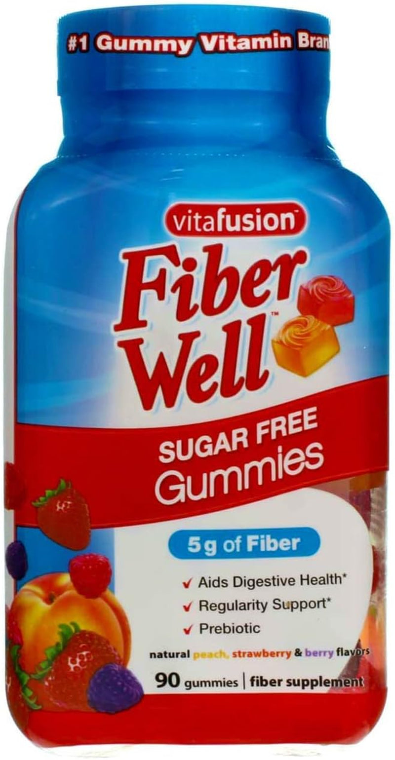 Vitafusion Fiber Well gummies help you get the fiber you may need to support digestive health with 5 grams of prebiotic fiber in each delicious, sugar-free gummy serving. Vitafusion Fiber Well gummies come in three delicious natural fruit flavors - peach, strawberry, and blackberry, so you can enjoy your fiber.