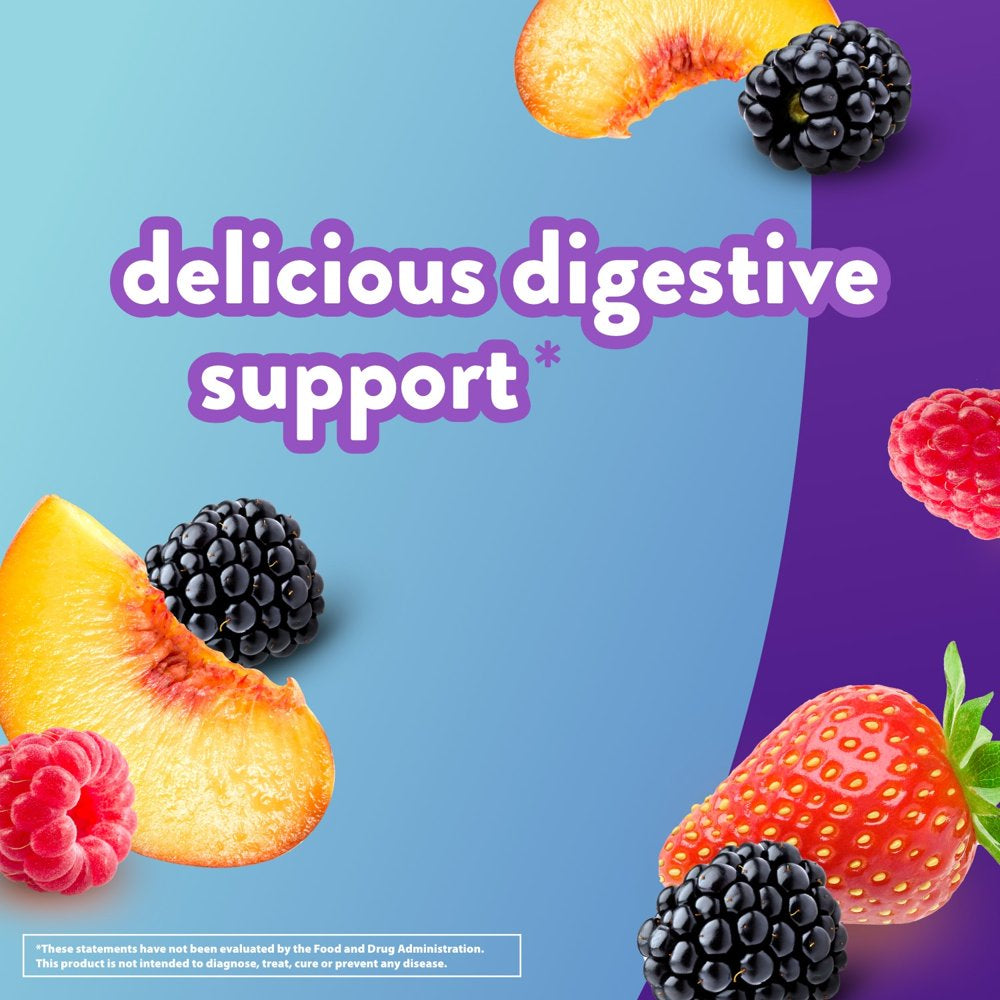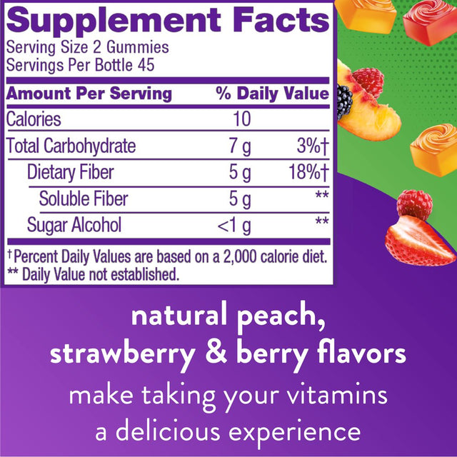 - Peach, strawberry and berry-flavored fiber gummies offer delicious, natural fruit flavors in every bite