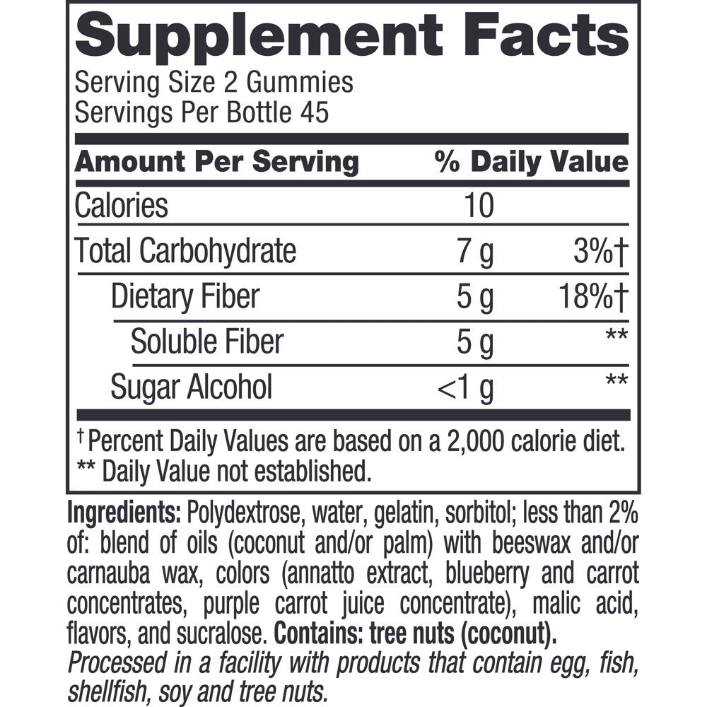 - Dietary supplement gummies contain prebiotic Fiber to help aid digestive health and support regularity (1)