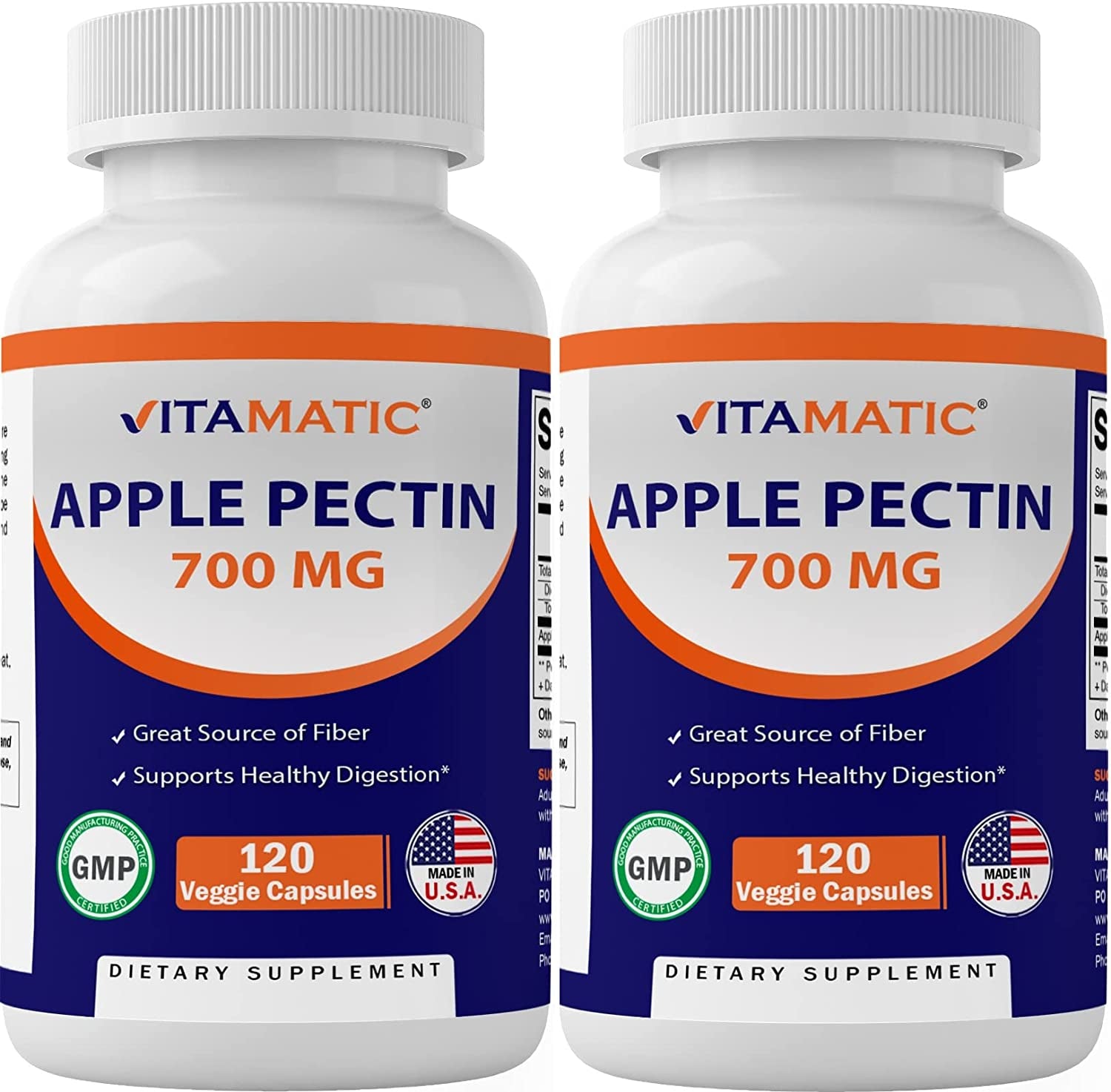 2 Pack Vitamatic Apple Pectin 700 mg 120 Vegetarian Capsules. Apple pectin is an excellent source of dietary fiber, and has been shown to:- Promote Regularity to Ease Symptoms of Constipation*- Supports Intestinal Health*- Support Healthy Digestion