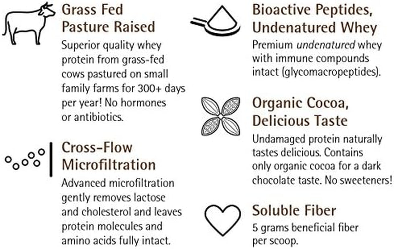 Daily Protein Plus Chocolate Daily Protein Plus Chocolate is superior quality, grass-fed, pasture-raised whey protein. We utilize a revolutionary cross-flow filtration process that leaves the protein undamaged, retains amino acids, and removes cholesterol, lactose, and casein. High quality whey protein makes an excellent breakfast! Only Four Ingredients! Daily Protein Chocolate contains four high quality ingredients: Grass-fed pasture-raised whey protein, fiber, organic non-alkalized cocoa, and non-GMO sunflower lecithin. This is the highest purity protein you will find! Daily Protein Plus Chocolate contains a high amount of protein (21 grams per scoop) and 5 grams of high quality guar gum fiber. We include less than 1 percent non-GMO sunflower lecithin to help the protein smoothly mix in water. Whey from Truly Grass-Fed, Pasture-Raised Cows We are taking the term "grass-fed" to the next level! The whey protein in Daily Protein Plus Chocolate is sourced from truly grass-fed cows that eat at least 95% grass and are pastured on lush small family farms for 300+ days per year! The cows are not fed any animal by-products or synthetic growth hormones. The whey protein is certified GMO-free, rBST-free, rBGH-free, BSE-free, antibiotic-free.Advanced Filtration, Bioactive Protein Daily Protein Plus Chocolate utilizes revolutionary cold-temperature, ceramic cross-flow microfiltration technology, which produces an undamaged (undenatured) whey protein isolate. During the production of whey protein, the goal is to concentrate the active components that support metabolism, muscle health, and immunity. However, extreme care must be taken not to damage these components, meaning the protein must be left in a non-denatured state to have proper biological activity. At the same time, undesirable components such as lactose, fat, and cholesterol are separated and removed.