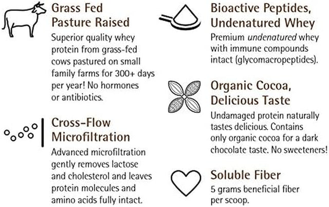 • Organic Cocoa, Naturally Delicious - Undamaged protein naturally tastes delicious. Contains only organic cocoa (non-alkalized) for a dark chocolate taste. There are no sweeteners of any kind! Mixes well without clumps for a smooth taste.