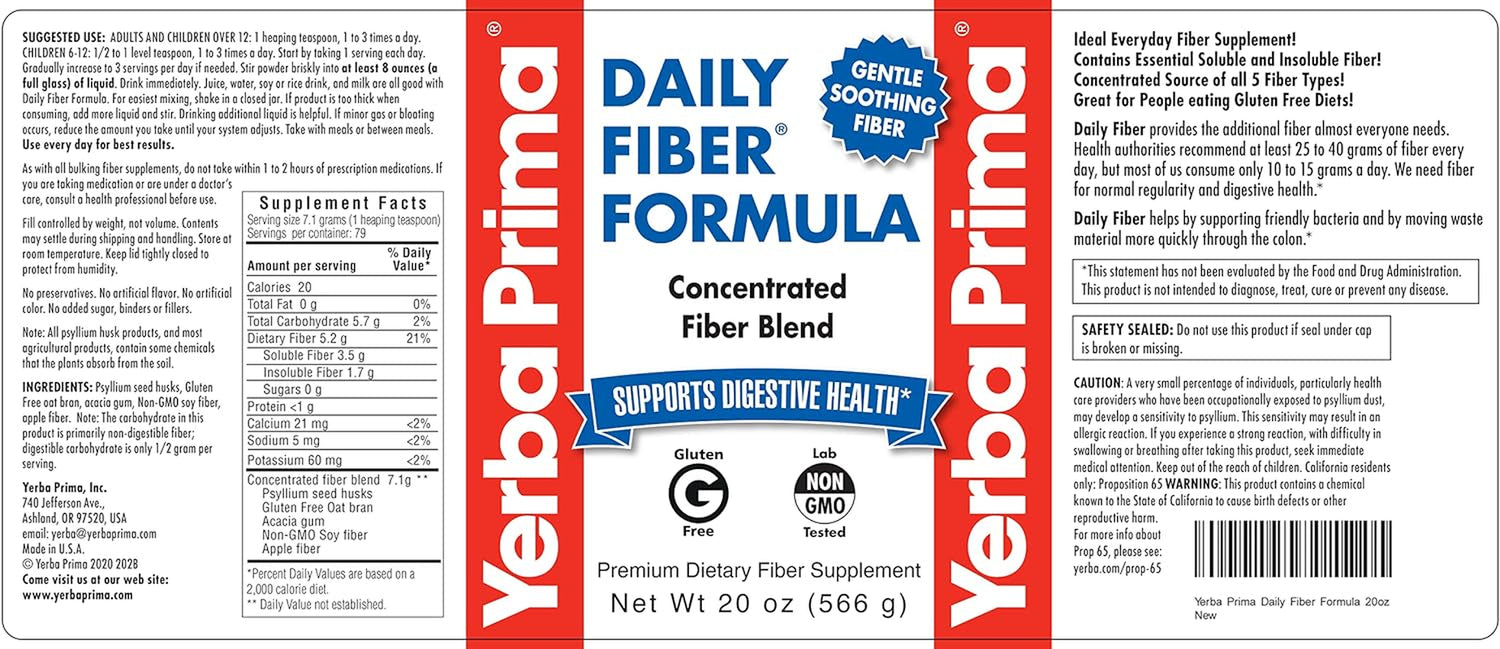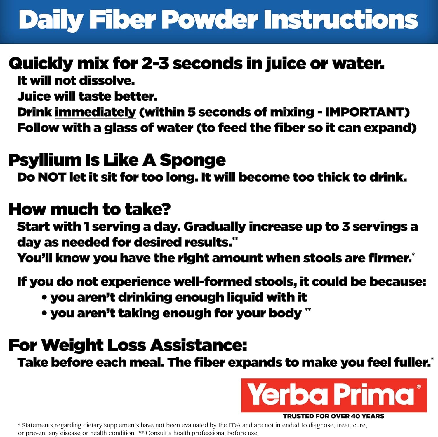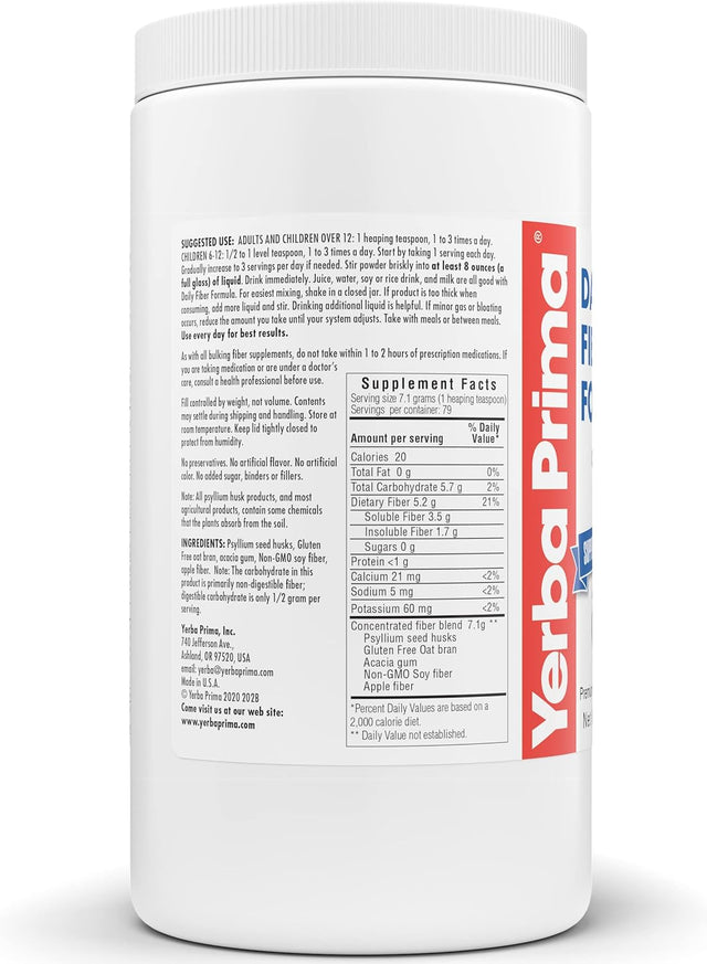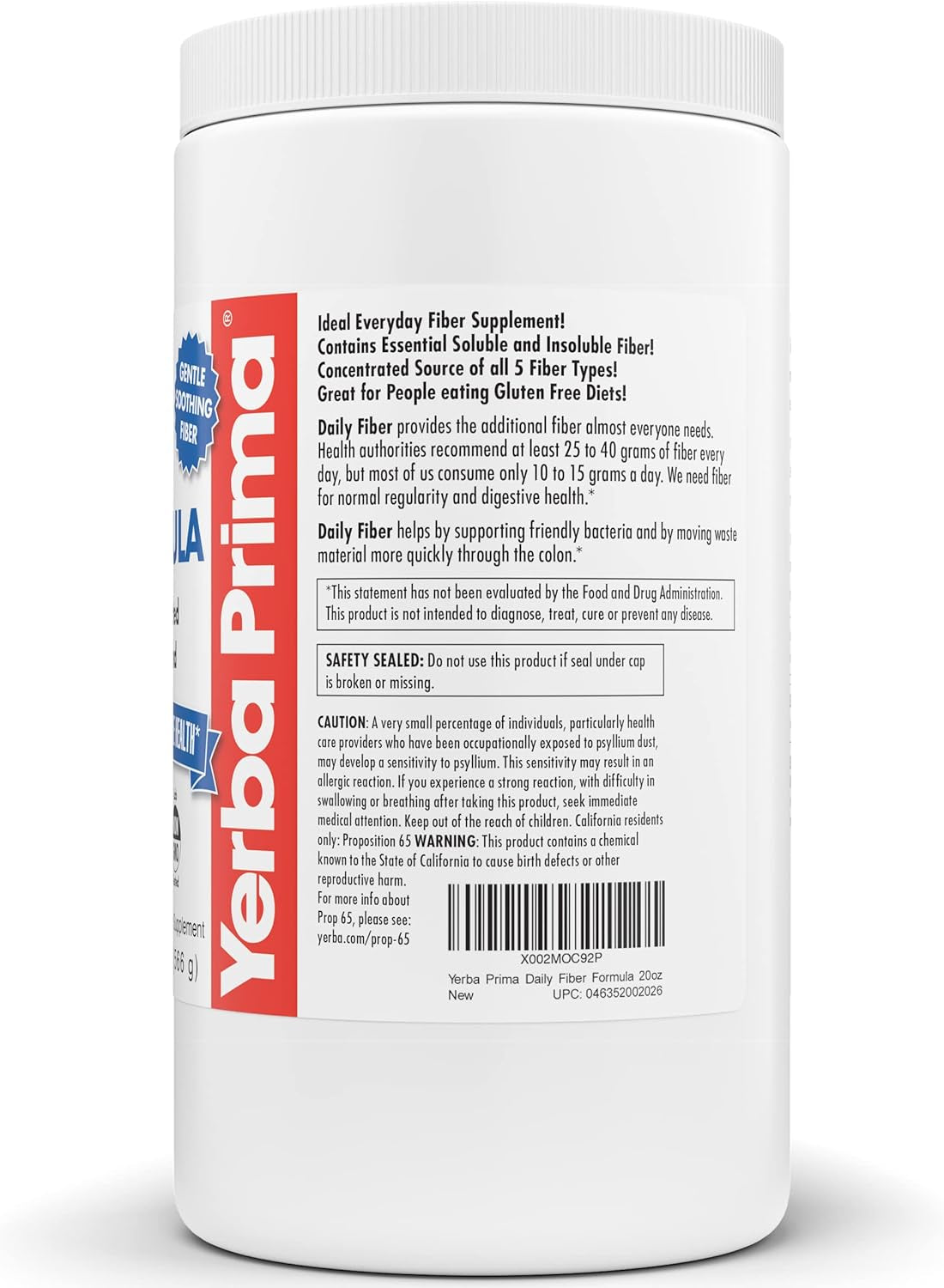 Yerba Prima Daily Fiber Formula - 20 Oz Powder - Unflavored, Concentrated Blend of Soluble/Insoluble, Psyllium Seed Husks, Acacia Gum, Apple Fiber for Bulk - Dietary Bulking Supplement - Regularity