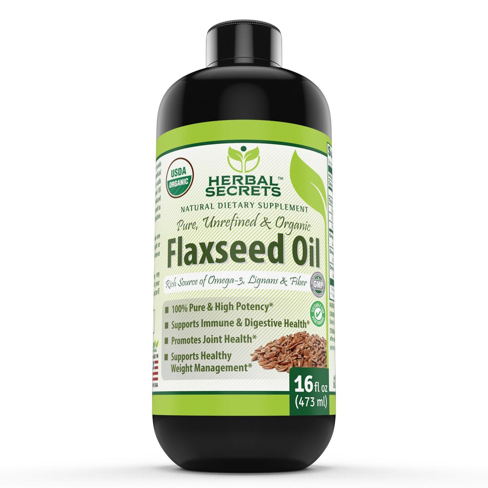 Herbals Secrets Pure, Unrefined and Organic Flaxseed oil 16 Fl Oz 100% Pure & High Potency Supports Immune & Digestive Health Promotes Joint Health Supports Healthy Weight Management Herbal Secrets Flaxseed Oil is cold pressed from the seeds of the plant Linun usitatissium. Flaxseed Oil is beneficial because it is rich in Omega-3 polyunsaturated fatty acids (ALA), Ligans (plant estrogen) and Fiber. Flaxseed Oil supports immune and joint health. It may help reduced pain caused by inflammation. Flaxseed Oil may be used as a laxative to support digestive health, releive constipation and support healthy weight management. Flax or Linum usitatissimum is a fibrous crop that is grown in many parts of the world and is commonly used to produce fabrics. In addition, the flax seed found inside of the plant's blue flowers has long been used in cooking in many parts of the world. Studies suggest that flax seeds are rich in a variety of nutrients, including: * Omega 3 fatty acids like alpha linoleic acid * Omega 6 fatty acids like linoleic acid * Omega 9 fatty acids like oleic acid * Dietary fiber * Heart healthy monounsaturated fats * Vitamin E Flaxseed oil provides a simple way to benefit from the omega 3 and other essential nutrients found in flax seeds, but only when the flax oil is properly produced. That's why Herbal Secrets Flaxseed Oil Dietary Supplement is the ideal choice of flaxseed oil liquid omega 3 supplements to add to your healthy diet! Herbal Secretsuses only organic flax seeds to make our flax seed oil supplement. By using only organic flax seed, we ensure that there are no harsh chemicals or artificial insecticides of any kind used on the flaxseeds plants. Our flax oil is manufactured in a GMP-certified facility to ensure purity, and we never add artificial flavorings, sweeteners, colors or preservatives. Plus, our flaxseed oil cold pressed, thus never exposed to heat to keep the omega 3 fatty acids and other beneficial nutrients intact. Flaxseed oil is often used to: * Promote Heart Health * Support The Immune System * Assist With Digestive Function And Bowel Regularity * Ease Inflammation And Promote Joint Health Complete your diet with Herbal Secrets Flaxseed Oil Dietary Supplement!