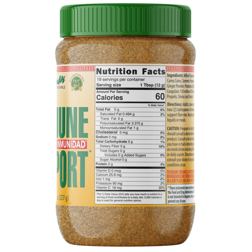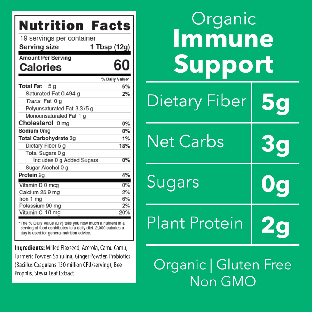 - Powerful Immune Booster: Our Immune Support Mix contains Milled Flaxseed, Acerola, Camu Camu, Turmeric, Spirulina, Ginger and Probiotics (Bacillus Coagulans 130 million CFU/serving). Excellent source of fiber and high in antioxidants. Promotes cardiovascular health and vitality. A great way to increase your intake of Omega-3 Fatty Acids and improve immunity.