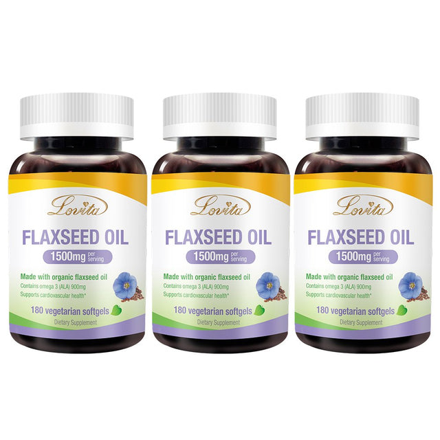 Lovita Organic Flaxseed Oil 1500Mg with Max 900Mg ALA, High Potent ALA Supplement, Vegan Omega 3 for Cardiovascular, Brain & Healthy Hair, Skin & Nails, Natural Flaxseed Oil, 180 Softgels (Pack of 3)