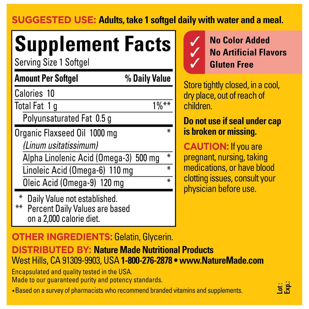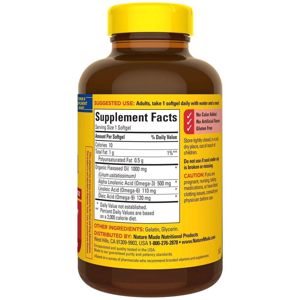 • Nature Made Flaxseed Oil 1000mg Softgels contain organic Flaxseed oil, which is a source of ALA (alpha-linolenic acid) Omega-3