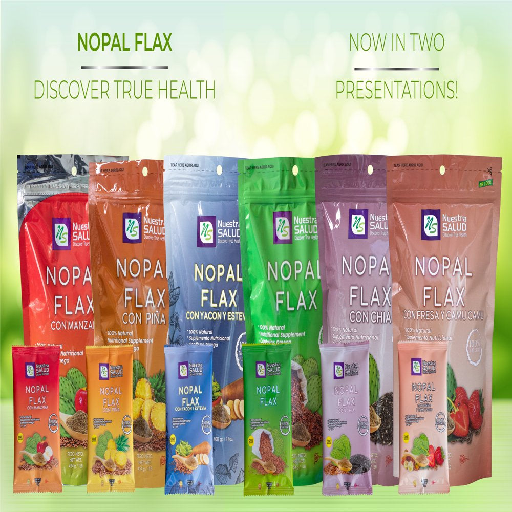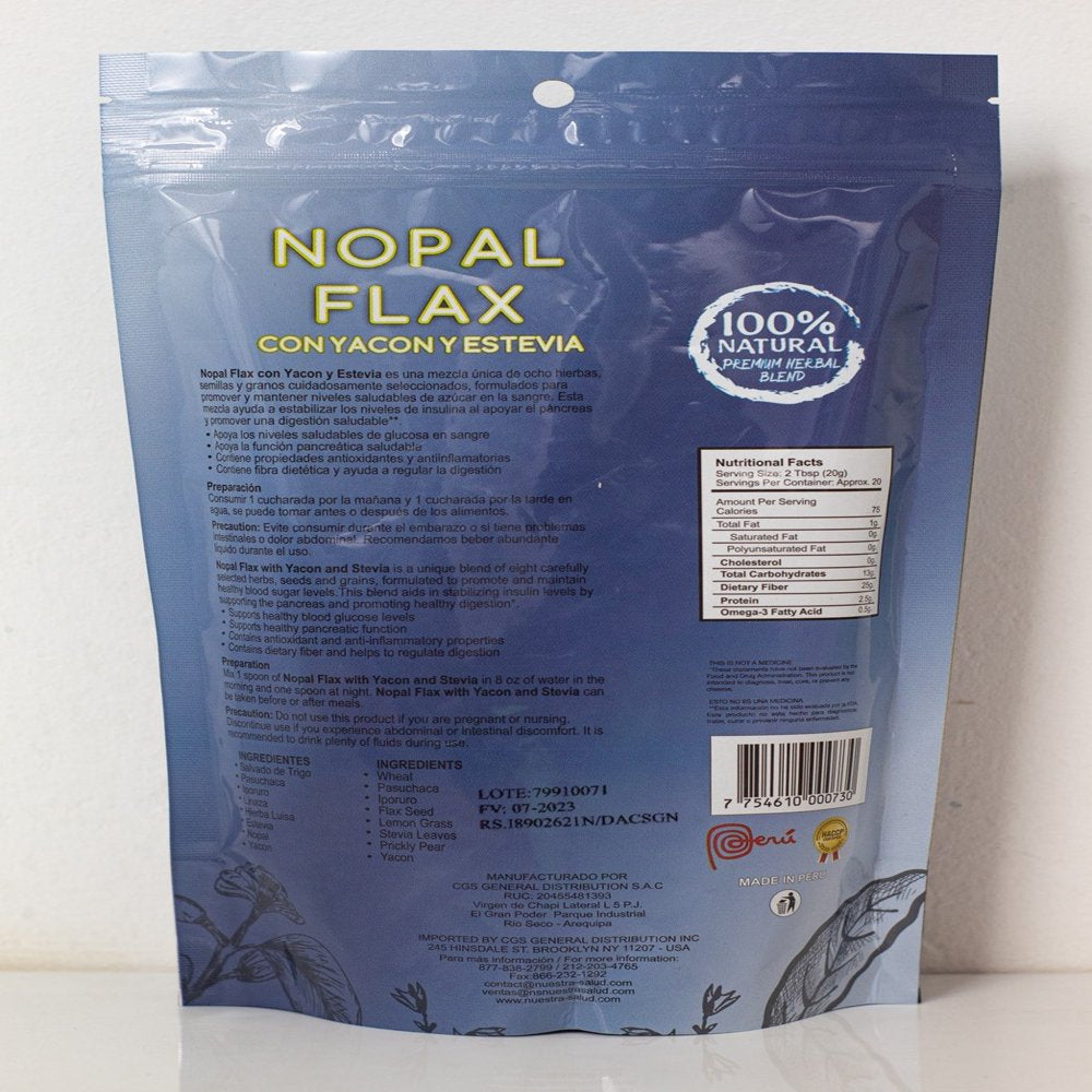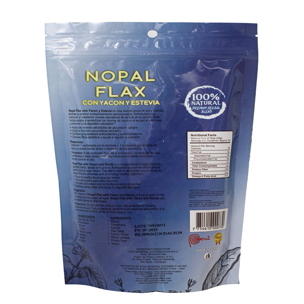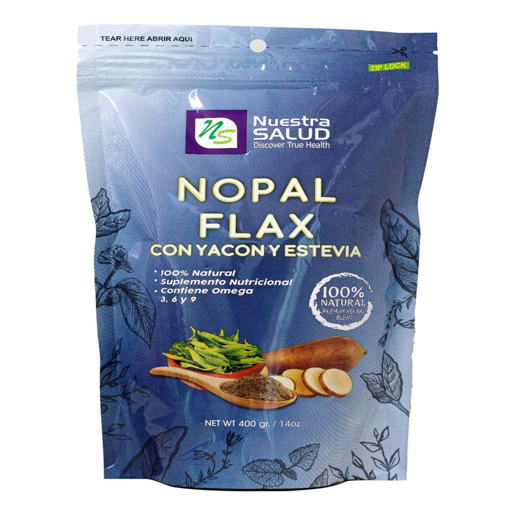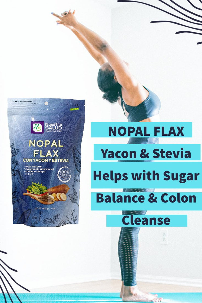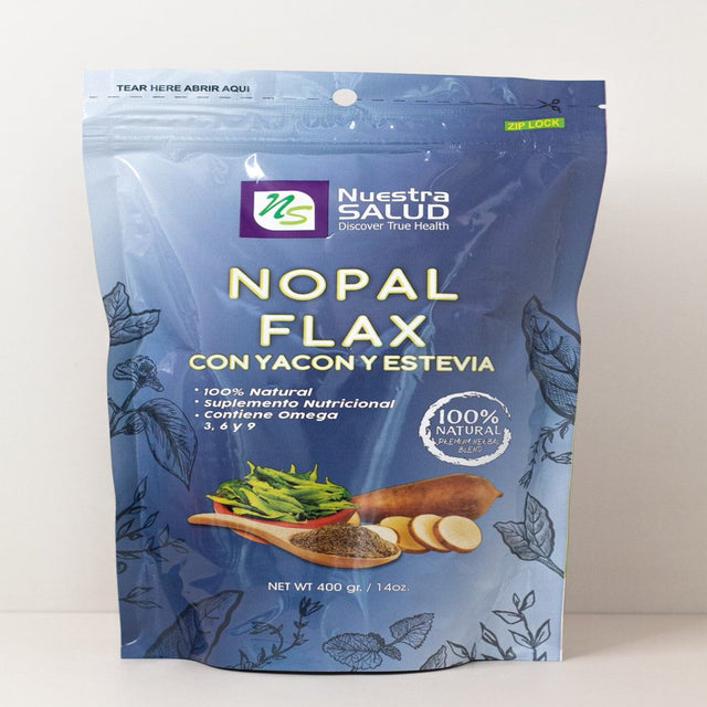 Nuestra Salud, Nopal Flax Linaza Plus Yacon & Stevia Flaxseed Fiber Dietary Supplement Powder This isn't just any ground flaxseed powder. It's elevated with Yacon root that’s rich in vitamin B1, B2, and C, and stevia that provides a hint of sweetness with zero calories perfect as a fit to go blend. Helps Maintain a clean and healthy colon Promotes vitality and healthy lifestyle Fiber rich Omega 3,6,9 Yacon root is very healthy.