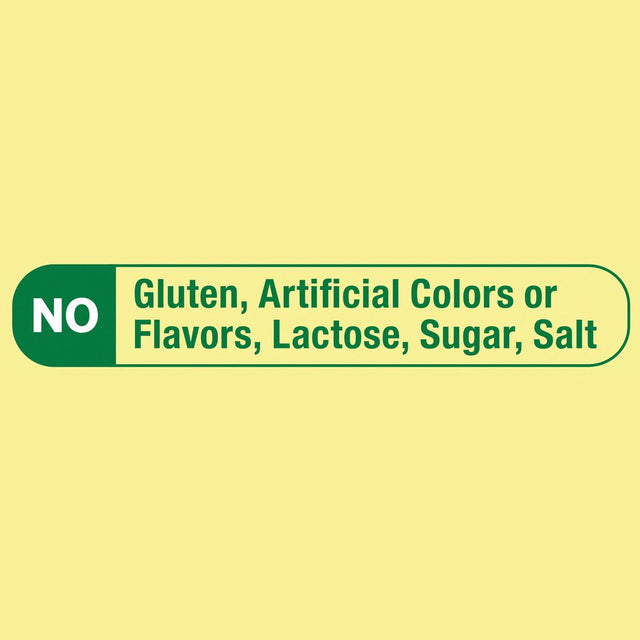 - No gluten, artificial colors or flavors, lactose, sugar, or salt